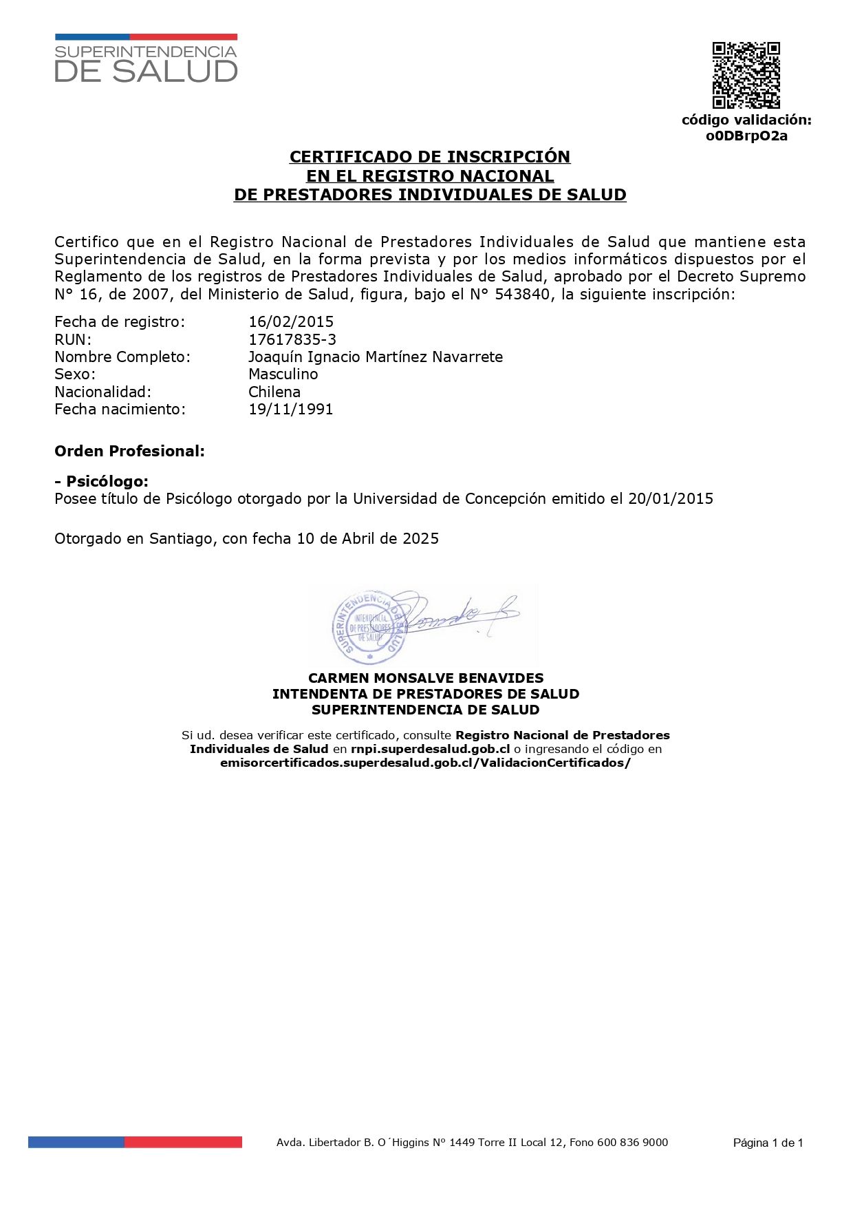 ¡Mucho gusto! mi nombre es Joaquín y egresé de la Universidad de Concepción. Como psicólogo me oriento a las necesidades de las personas o familias, y me caracterizo por un trato cálido. Me encuentro en permanente formación, contando con diplomados, postítulo y diversos cursos asociados a la psicoterapia. Cuento con 9 años de experiencia junto a adolescentes y adultos en diversas problemáticas. Con experiencia acompañando personas en duelos, consumos problemáticos, "adicciones", "ansiedad", "depresión", dificultades familiares, "estrés postraumático", ansiedad social. He atendido a personas con diagnósticos salud mental (como "trastornos de personalidad", "TLP"), personas que transitan momentos difíciles en la vida, o que necesitan orientación para sus hijos e hijas. También tengo experiencia acompañando a personas que han respondido a experiencias difíciles como abuso sexual, físico y psicológico. Cuento con postítulo en psicoterapia constructivista en contexto de alta complejidad, diplomados en salud mental y terapia narrativa, como también actualizaciones en varias temáticas afines como "trauma", condición del espectro autista, pruebas gráficas, problemas con la alimentación e imagen corporal, diagnósticos de salud mental en la línea de la personalidad, etc). Espero que puedan sentirse en un espacio seguro, como también sus seres queridos que consulten.