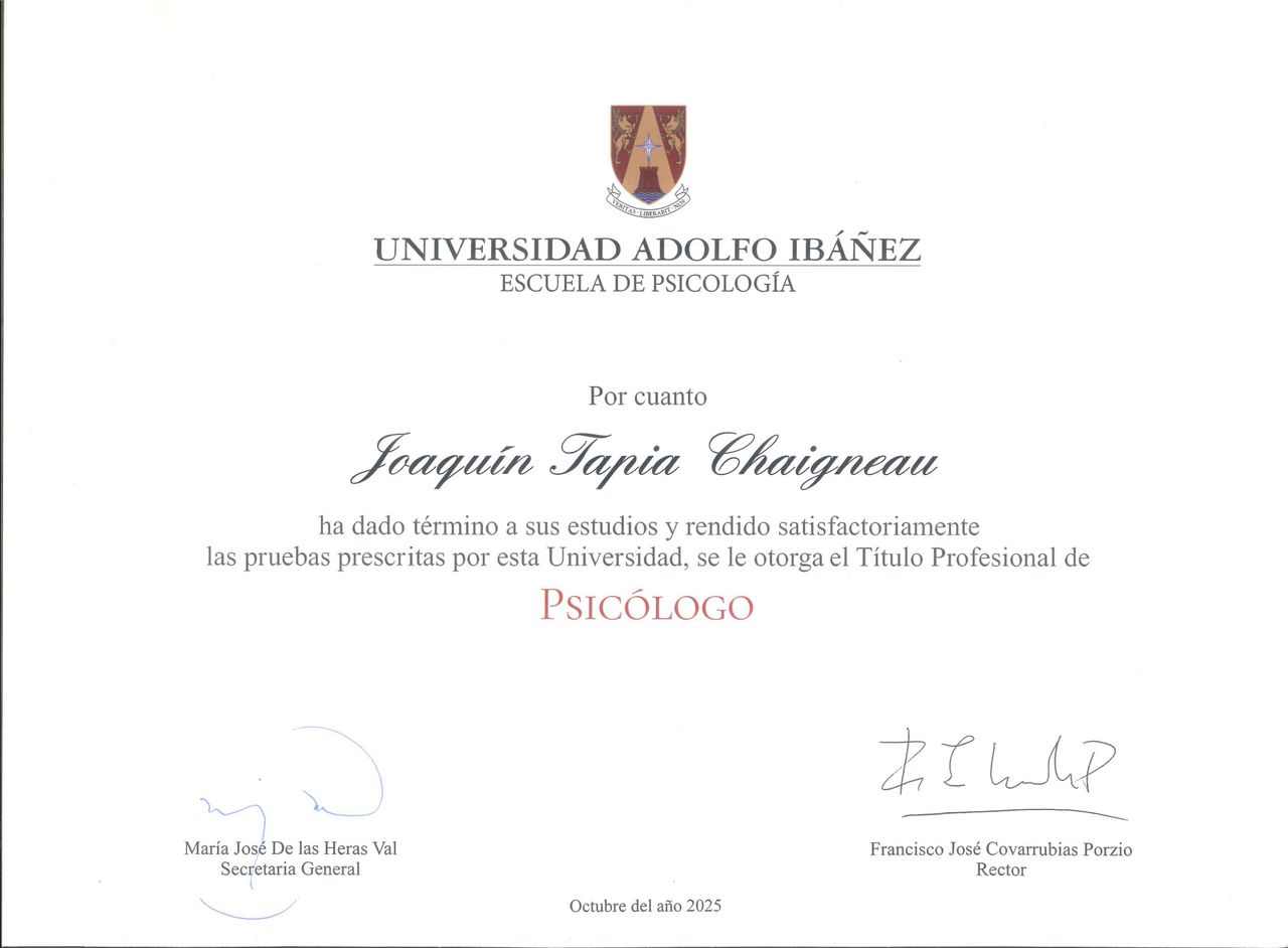 Soy Psicólogo Clínico y Magíster en Psicología Clínica por la Universidad Adolfo Ibáñez. Acompaño principalmente a adultos que atraviesan experiencias de trauma emocional, dificultades vinculares, crisis vitales, duelos/pérdidas o una sensación persistente de estancamiento personal.