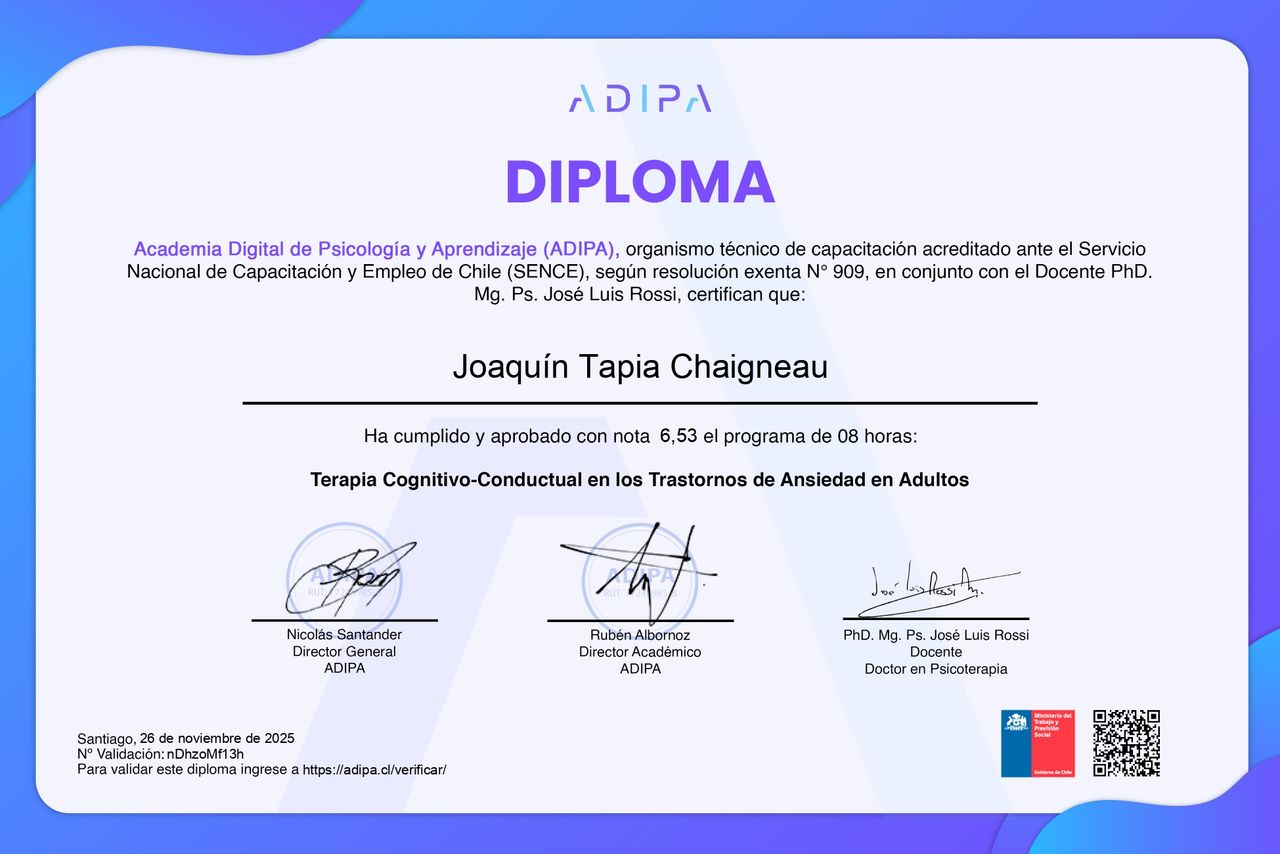 Joaquín ha sido crucial para el momento de ansiedad que estoy viviendo en este momento. Cada sesión es un espacio de alivio en el que me entrega herramientas. Lo recomiendo totalmente.
