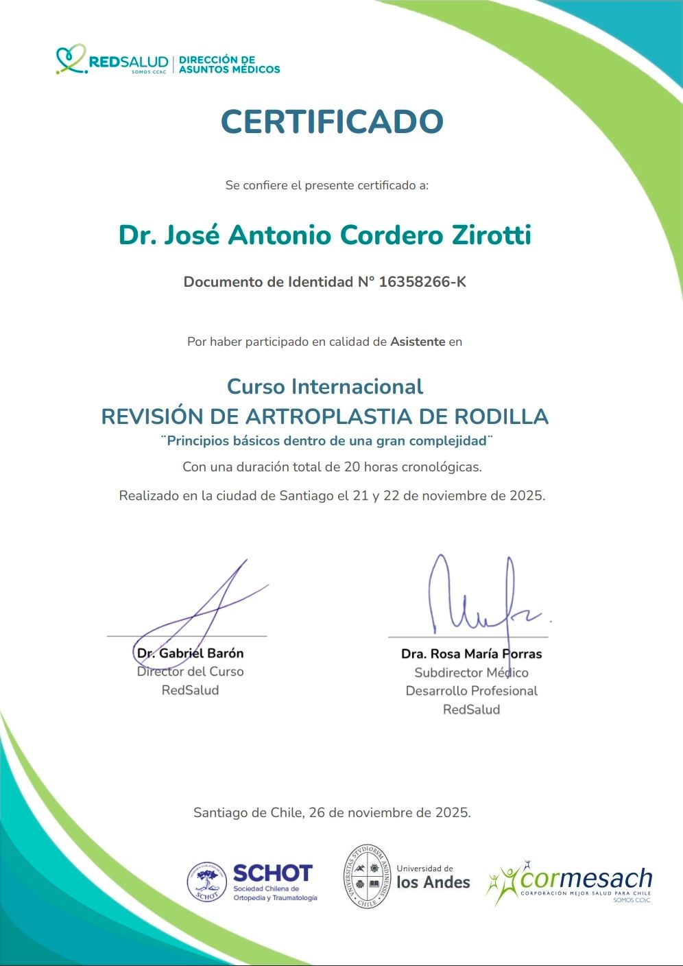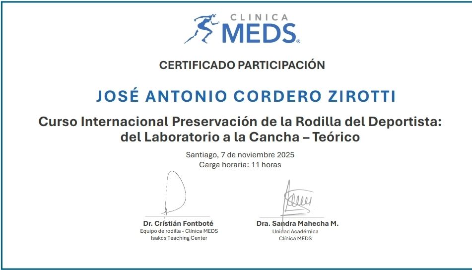 Realicé mi especialidad en Ortopedia y Traumatología, y luego profundicé mi formación con una subespecialidad en cirugía artroscópica y reconstructiva de rodilla en Clínica Las Condes, impartida por la Universidad de Chile el año 2021. Desde entonces, me he mantenido en constante actualización a través de cursos en Chile y en el extrangero y actividades académicas para entregar el mejor tratamiento posible a mis pacientes.
