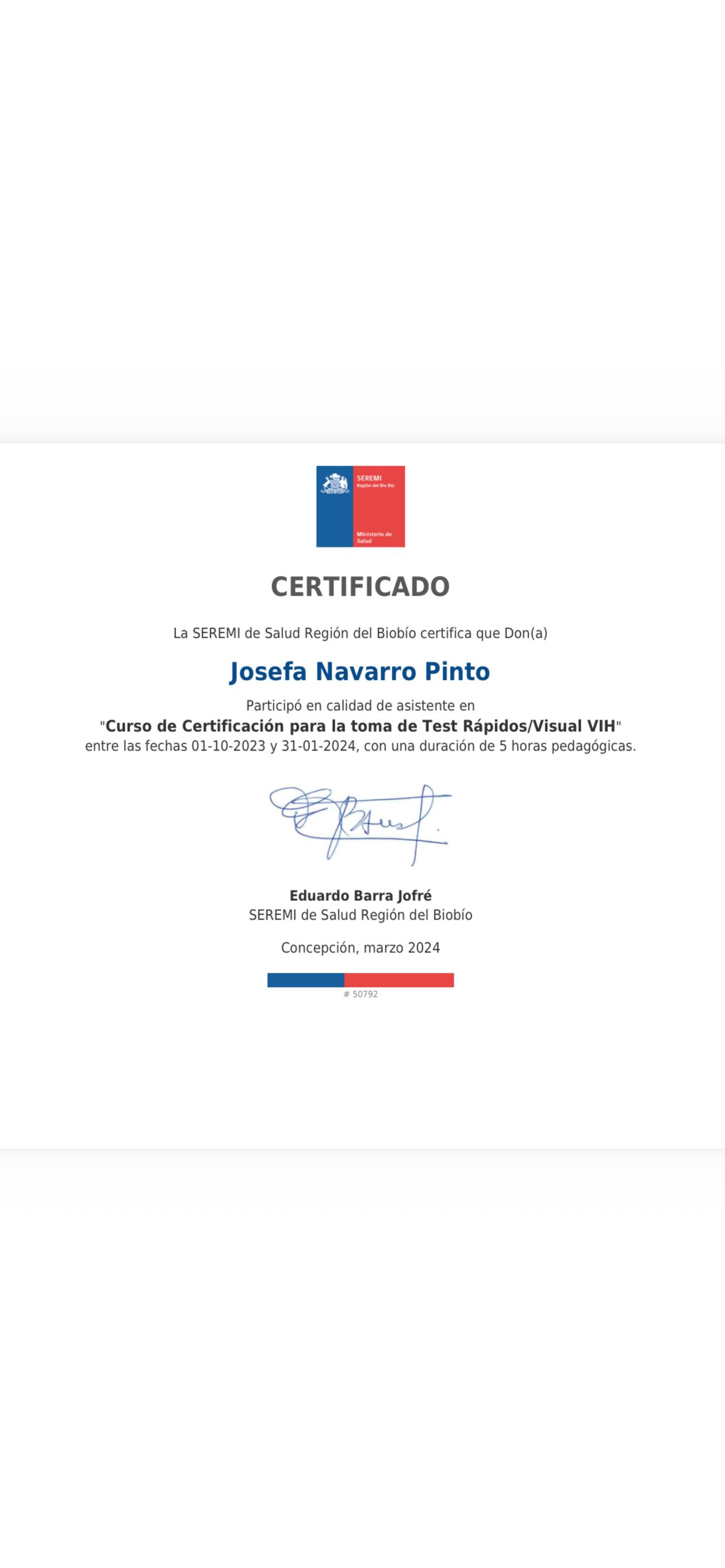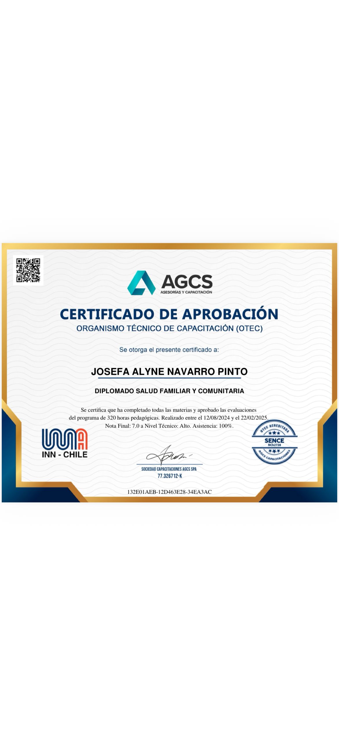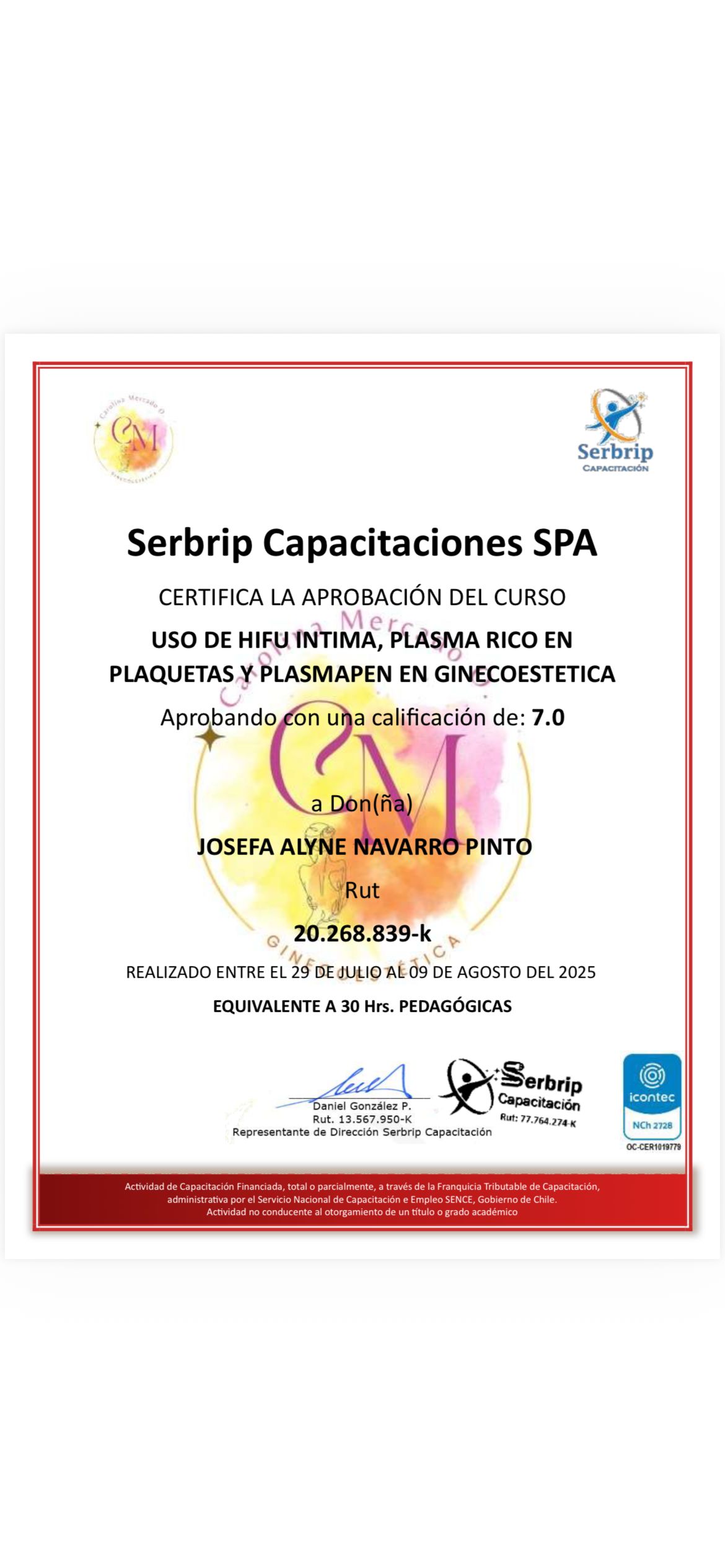 En cuanto a mi formación soy titulada como Matrona y Licenciada en Obstetricia y Puericultura por la Universidad de Concepción, cuento con Diplomado en Salud Familiar y Comunitaria y Diplomado en Cuidados Materno Ginecológicos, cursos de Salud Menstrual, Lactancia Materna y Alimentación Complementaria, Manejo de Infecciones de Transmisión Sexual (ITS) y diversas certificaciones en Salud Sexual y Reproductiva; también cuento con cursos de Buen Trato y Satisfacción Usuaria, Técnicas de Gestión de Calidad y Acreditación en Salud. Además, soy Consejera de Lactancia Materna y Monitora de VIH/SIDA e ITS certificada por SEREMI. Asimismo, cuento con certificación en Uso de HIFU íntima, Plasma Rico en Plaquetas y Plasmapen en Ginecoestética y actualmente, me encuentro cursando un Diplomado en Piso pélvico y otro Diplomado en Planificación Familiar y Educación Sexual, en pos de aportar y mejorar cada día con conocimientos actualizados la Salud Sexual y Reproductiva de mis usuarias/os.