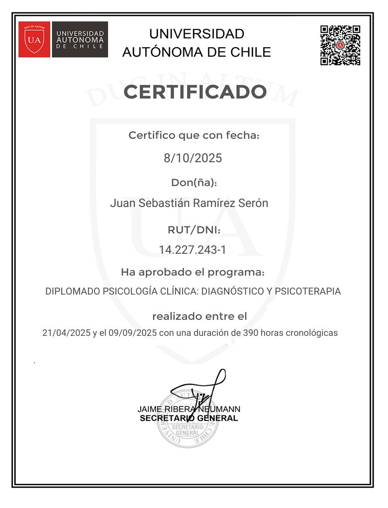 Hola, soy Sebastián Ramírez Serón, psicólogo clínico titulado con distinción máxima en la Universidad Santo Tomás.