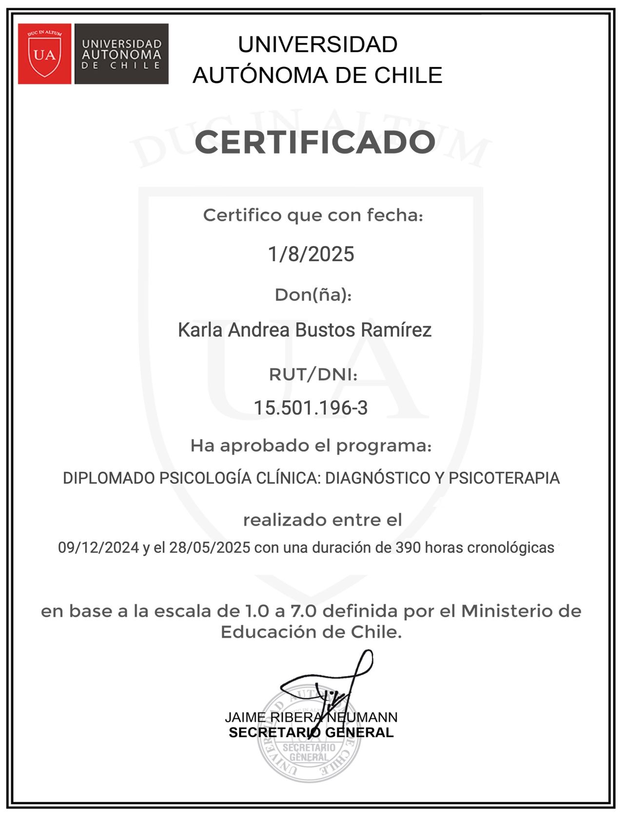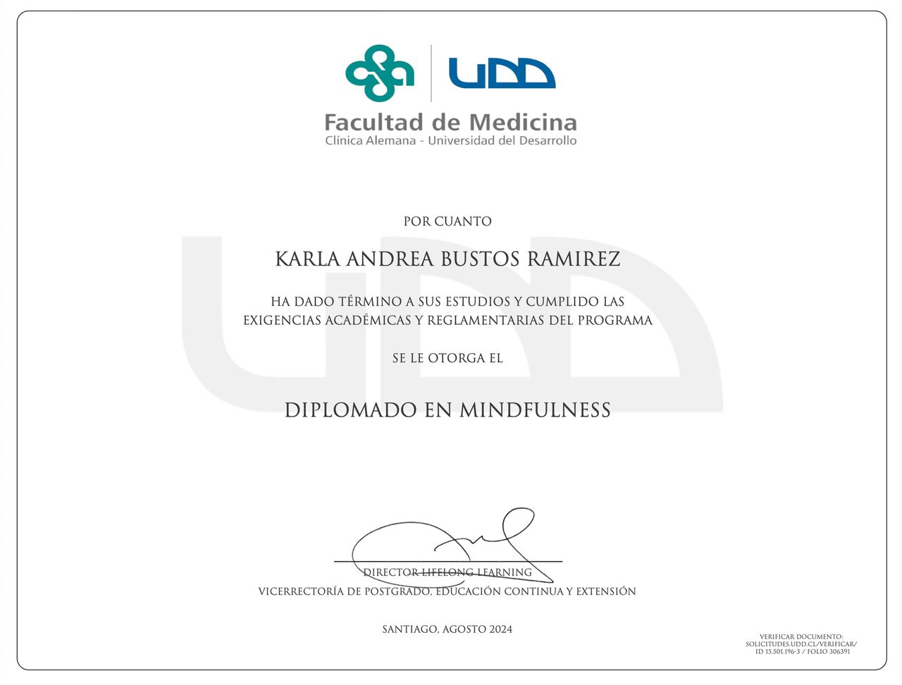 recomiendo a mi psicóloga Karla me a ayudado bastante en mi auto cuidado. Me enseño hacerme responsable de mi salud mental.