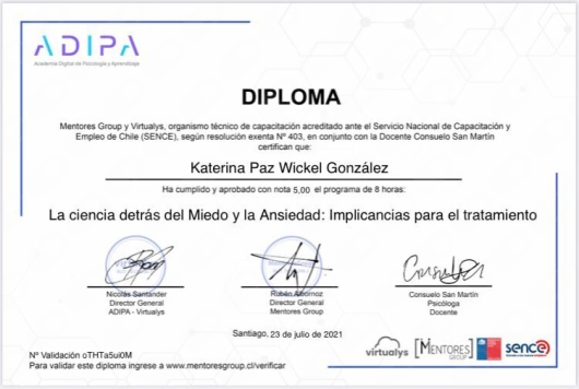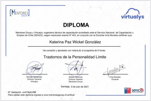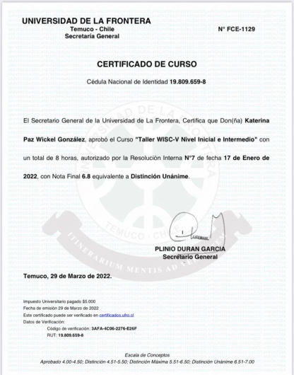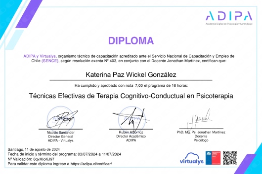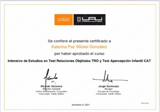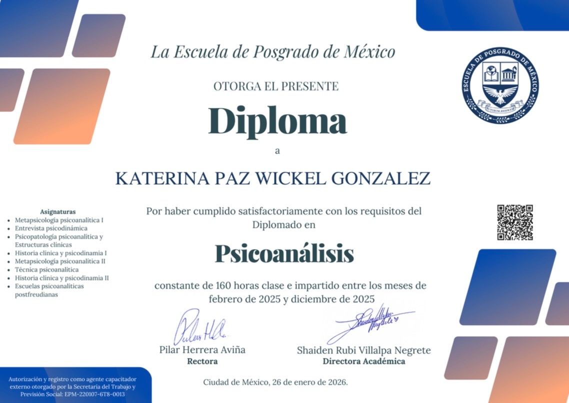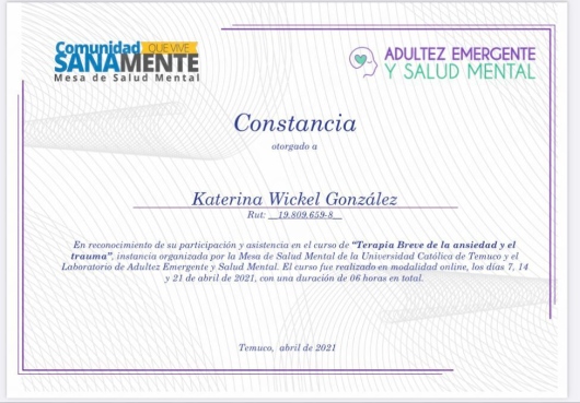 Psicóloga egresada de la Universidad de La Frontera, con Máster en Psicoterapia Integral, con enfoque de psicoanálisis relacional, de la Universidad de Salamanca.