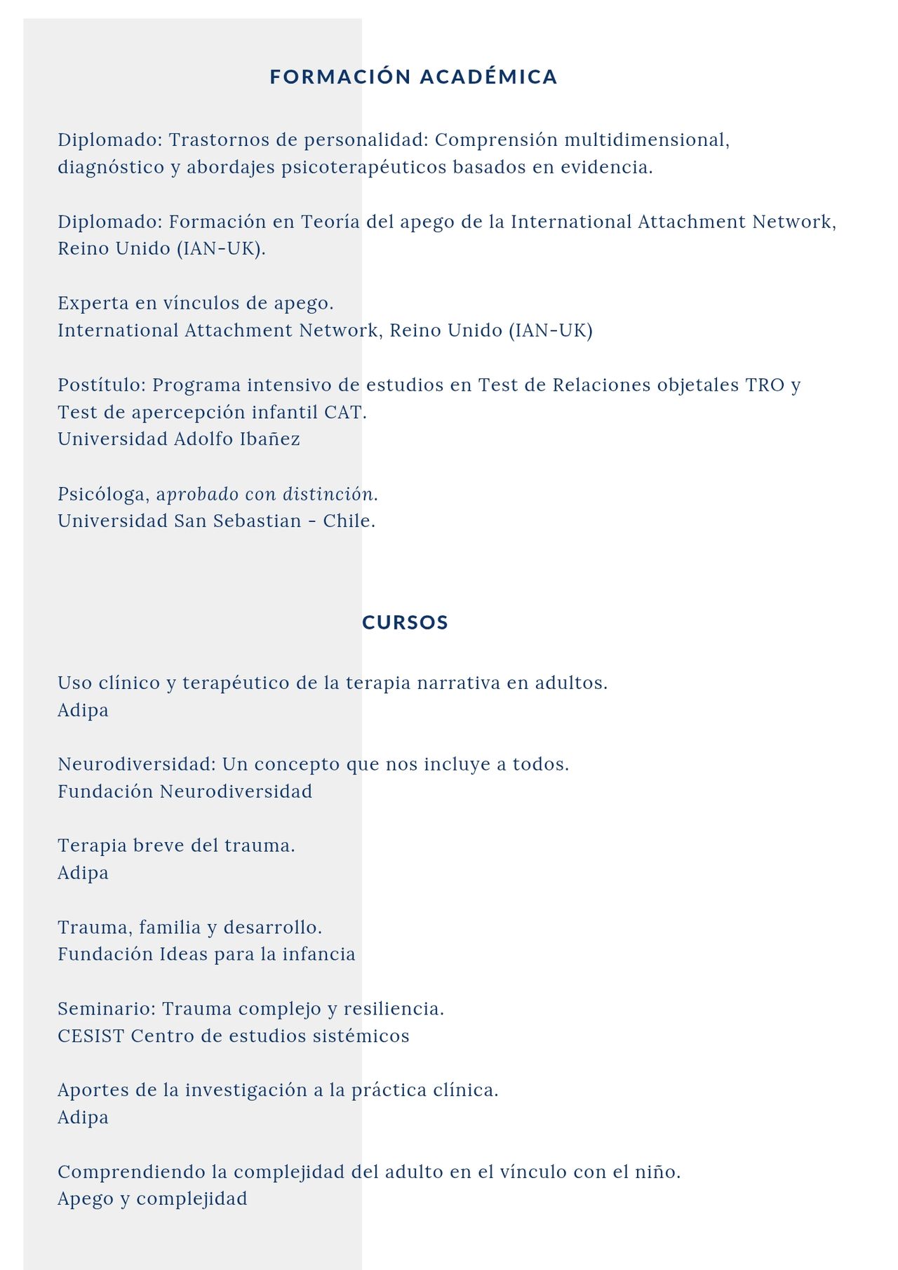 Comprendo la psicoterapia como un espacio dentro del cual surgen posibilidades de cambio, permitiendo experimentar nuevas formas de relacionarse, enfrentar dificultades y/o buscar bienestar. Mi compromiso es acompañar a cada persona y/o familia con cercanía y respeto en su proceso, brindando atención personalizada en base a los desafios, necesidades y recursos que cada uno posea.