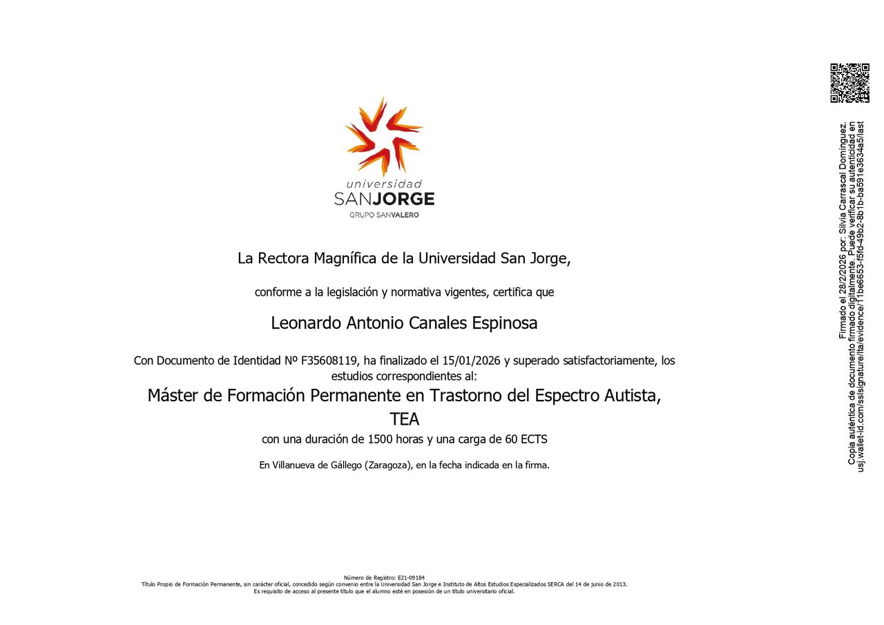 Magister en Trastornos del Espectro Autista, Universidad San Jorge de Zaragoza, España