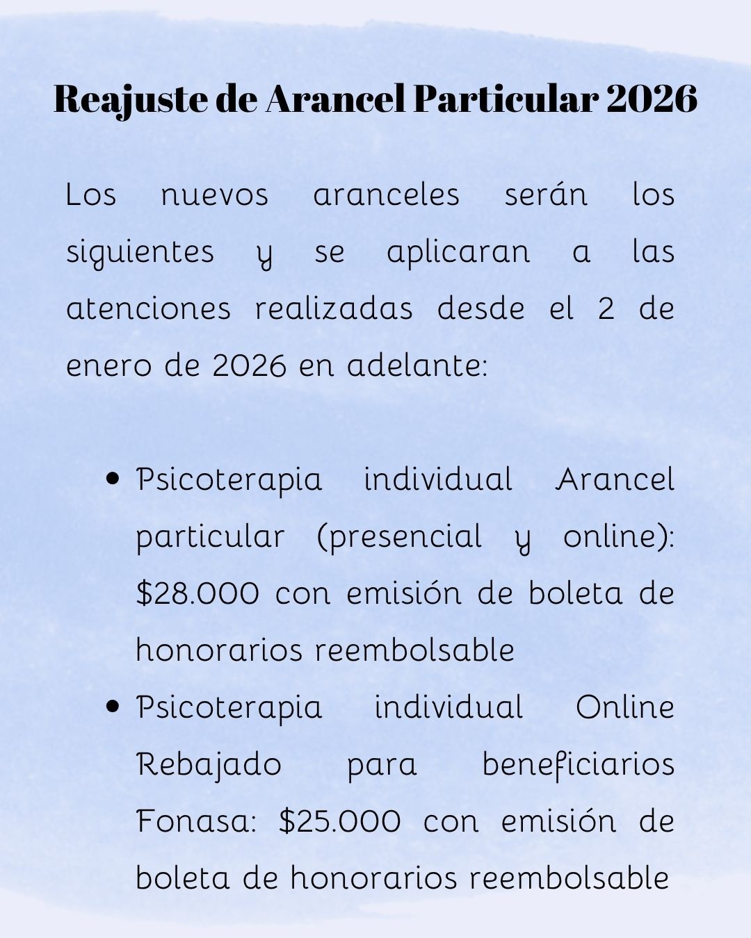 Psicoterapia individual Arancel particular (presencial y online): $28.000 con emisión de boleta de honorarios reembolsable