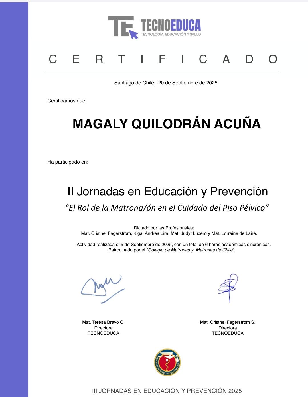 Matrona con más de treinta años de experiencia en el área ginecológica, obstétrica, y de neonatología en el sector privado y público. Con experiencia en la atención del paciente desde el inicio del embarazo hasta el periodo de puerperio. Además desarrolla actividades de laboratorio como la toma de muestras de exámenes. Experiencia en policlínico de nivel primario y secundario.