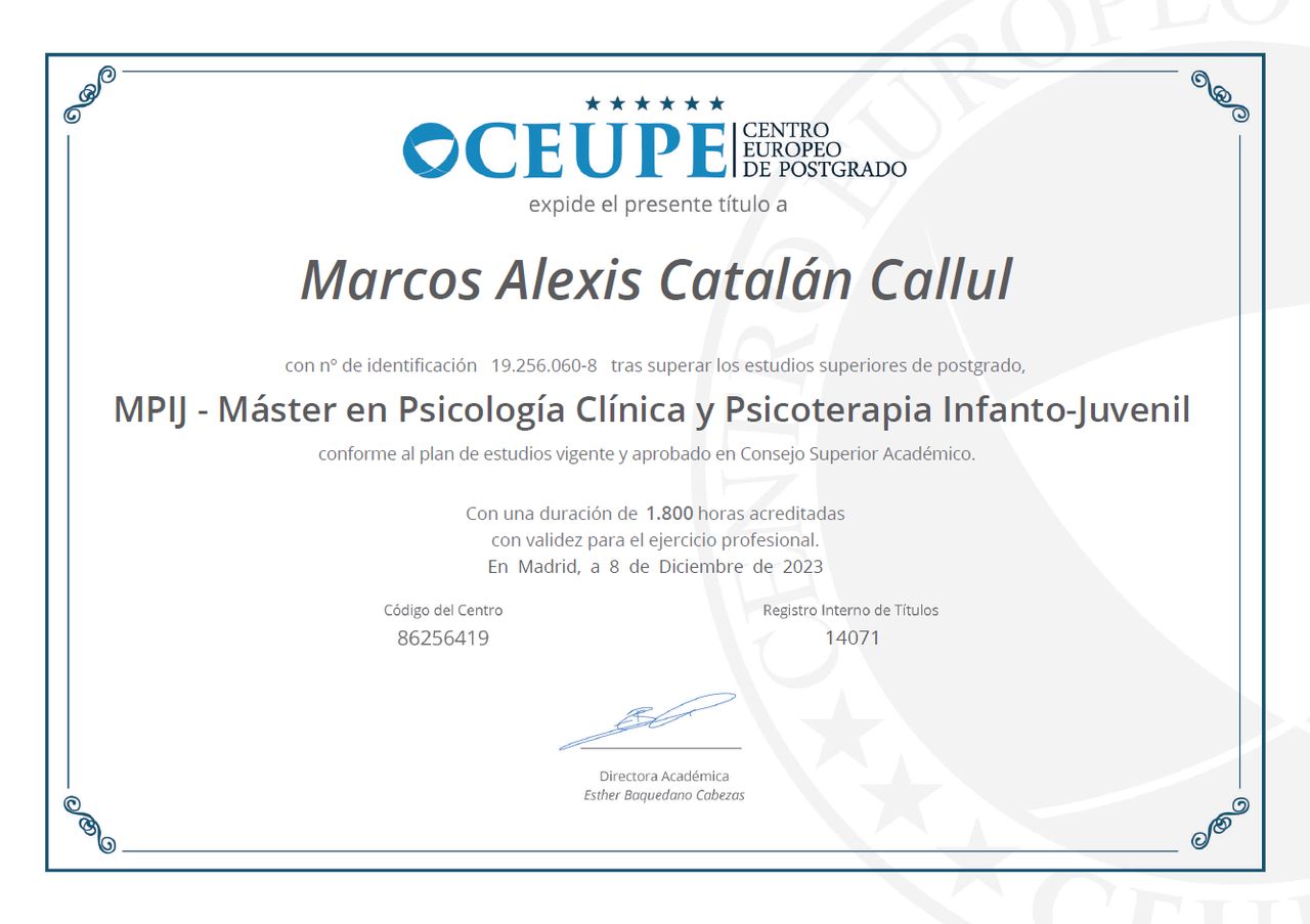 Soy Marcos Catalán, psicólogo magíster en psicología clínica y psicoterapia infanto-juvenil, con experiencia en terapia de jóvenes, adultos, parejas y labor educacional, acompañando también en proceso de apoyo a la crianza responsable y respetuosa. Me gusta lo que hago y entendiendo que hemos de ir formándonos constantemente como profesionales pero más aún como personas.