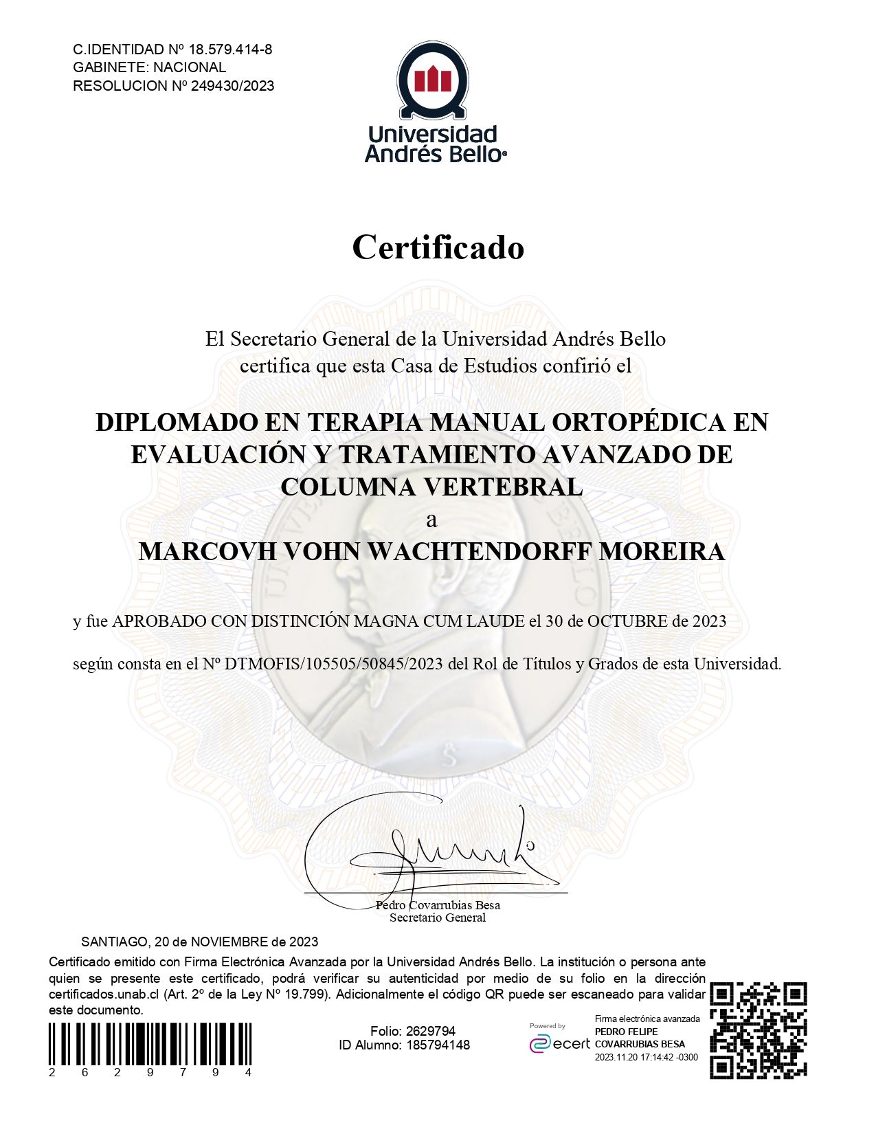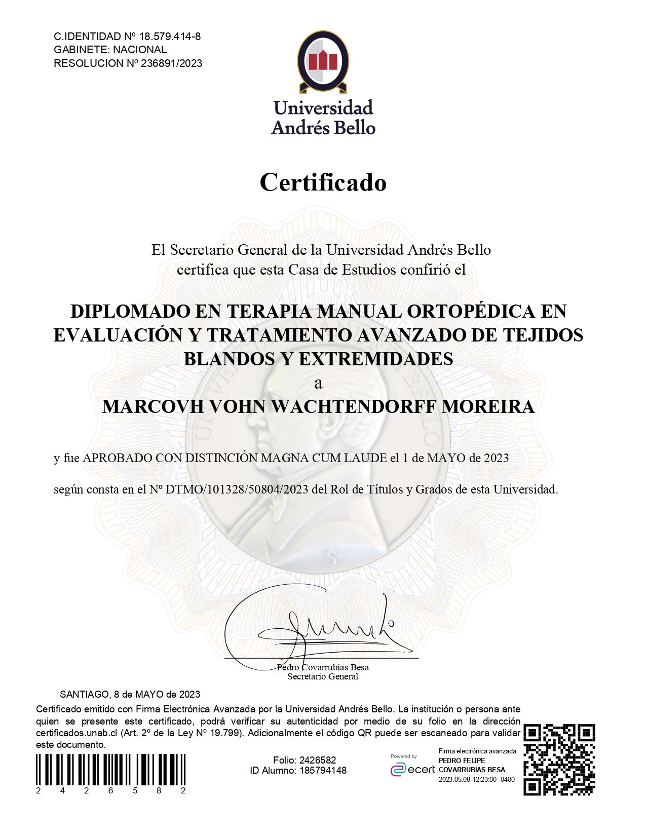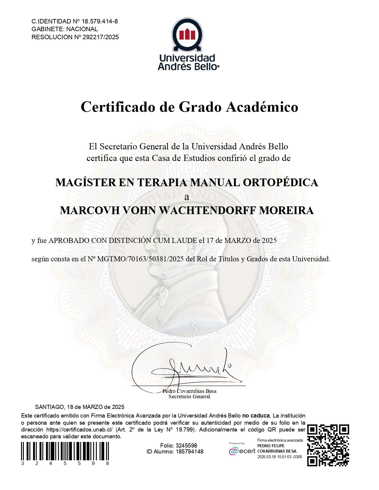 Mi dedicación a la especialidad se respalda en mi extensa formación de postgrado, incluyendo un Magíster en TMO (UNAB), Diplomados Avanzados en Terapia Manual Ortopédica (UNAB) y un Diplomado en Rehabilitación Musculoesquelética de la Universidad de los Andes. Esta formación integral garantiza un plan de tratamiento riguroso y efectivo.
