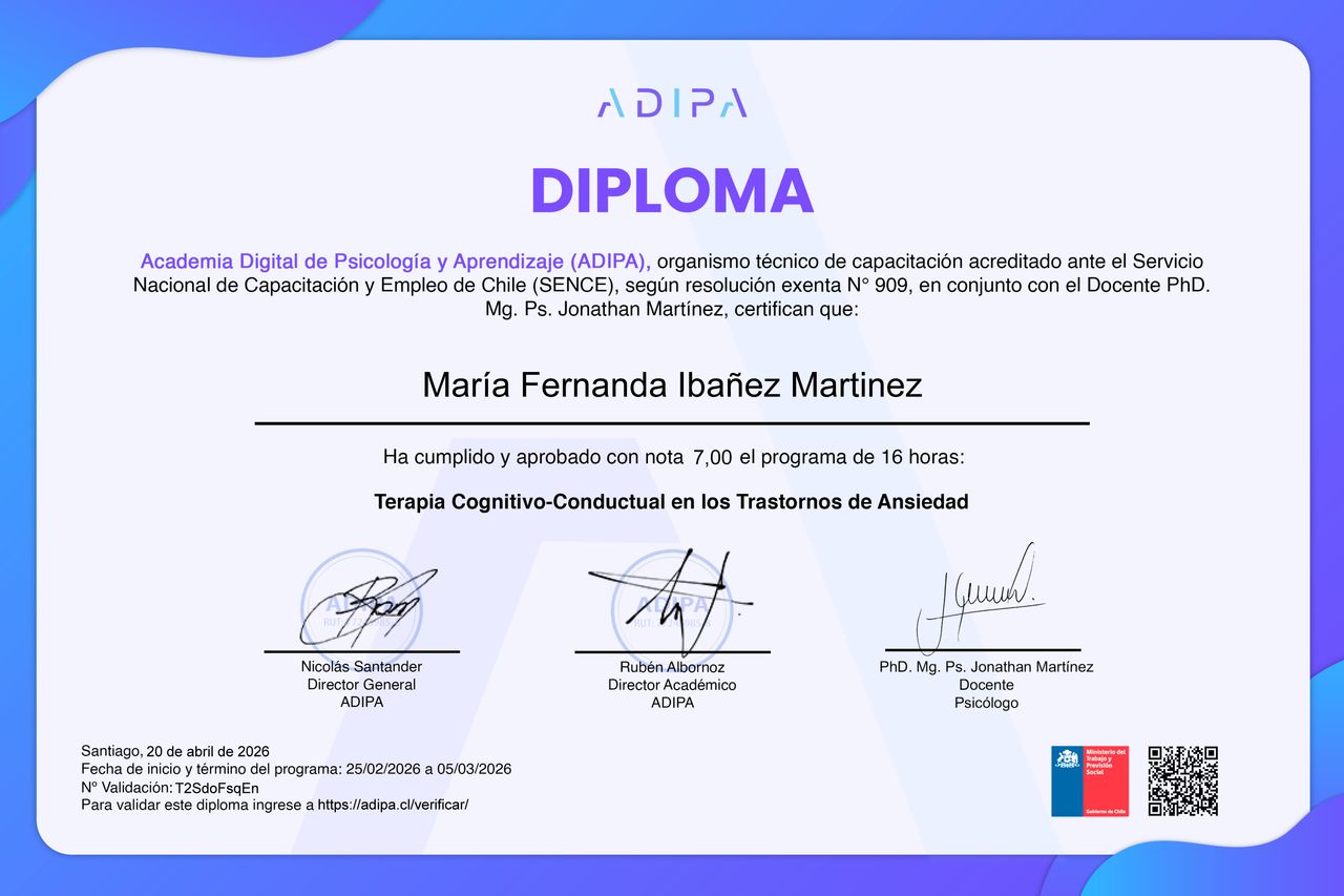Soy María Fernanda Ibáñez Psicóloga Clínica con formación en Terapia Cognitivo-Conductual (TCC), orientada a brindar herramientas prácticas y eficaces para la gestión emocional y el cambio conductual a adolescentes y adulto.