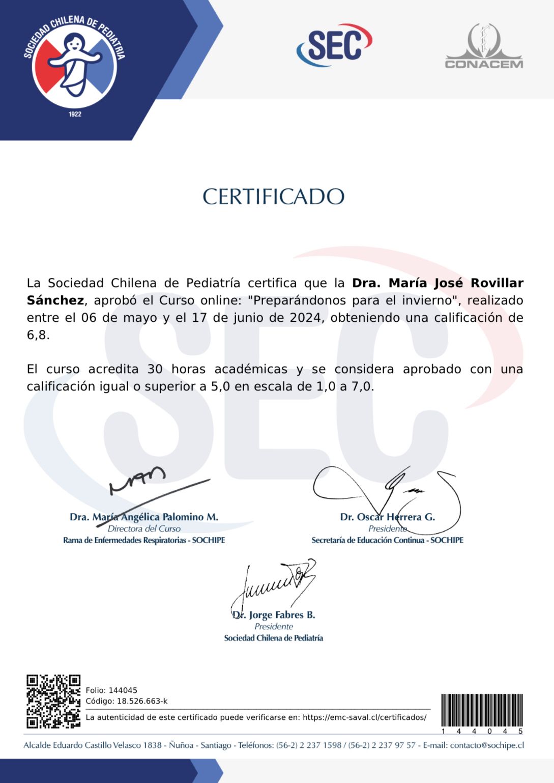 Soy María José Rovillar, Pediatra de la Universidad de Chile, formada en el Hospital de Niños Dr. Roberto del Río. Desde mi egreso me he desempeñado en el servicio público, atendiendo a pacientes hospitalizados y ambulatorios, cumpliendo mi Periodo Asistencial Obligatorio en la Isla de Chiloé.