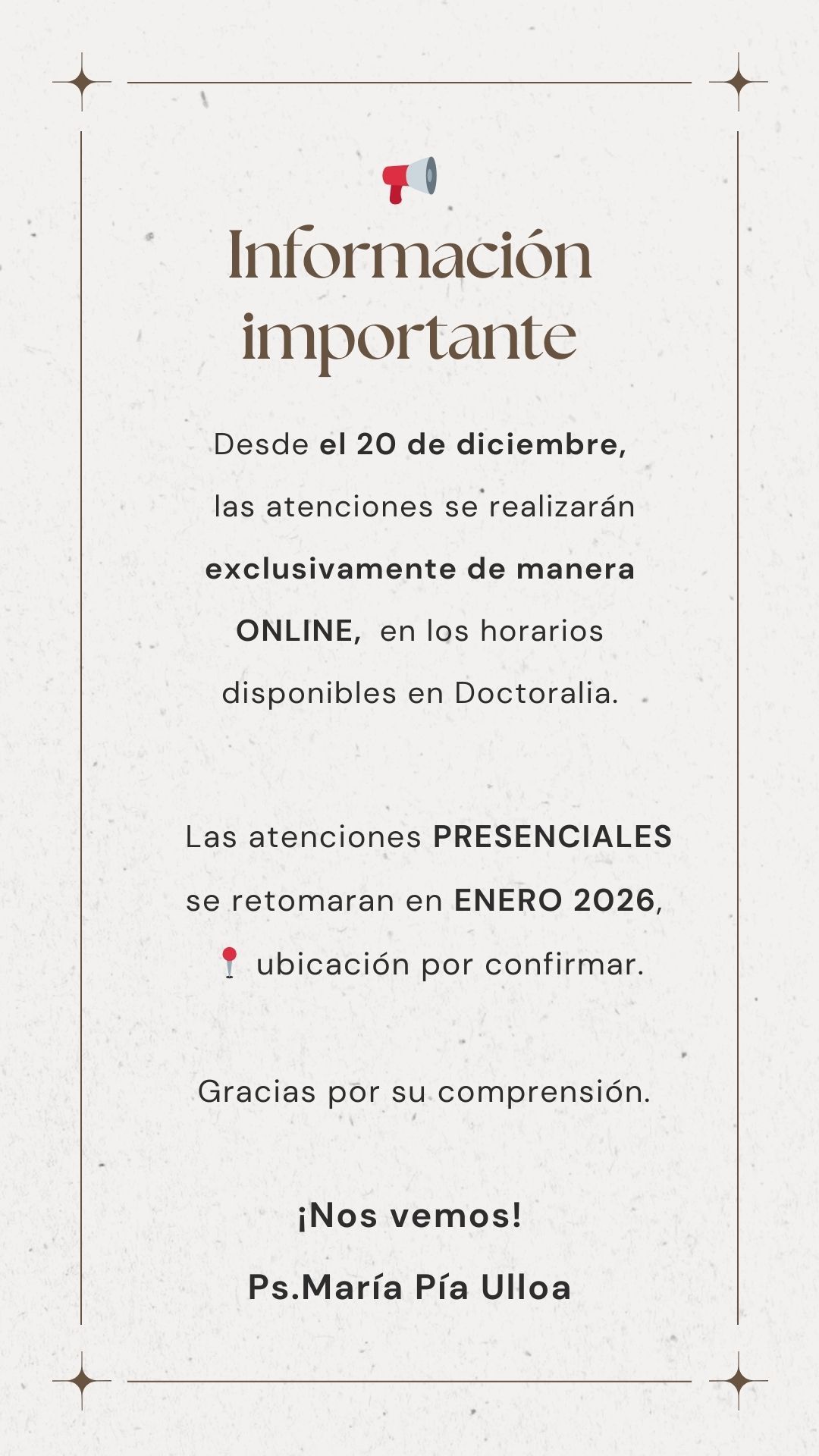 Ultimo día de consultas presenciales: Jueves 18 de diciembre 2025. Retomamos en ENERO 2026, ubicación por confirmar :)