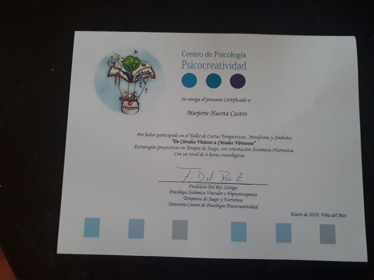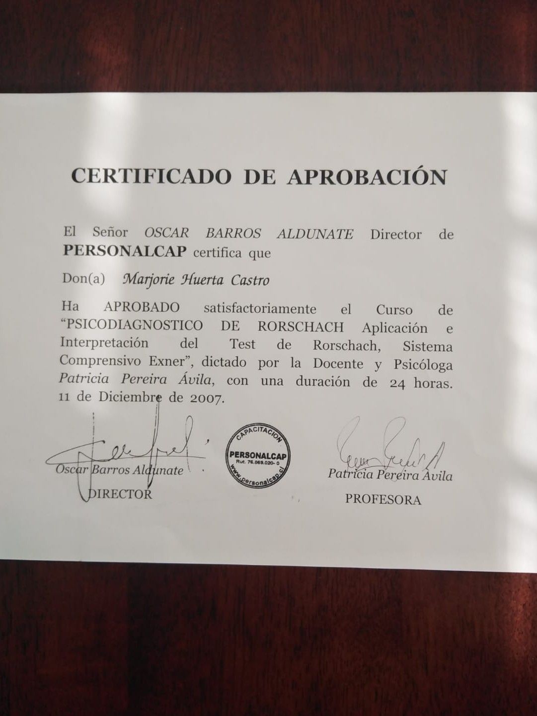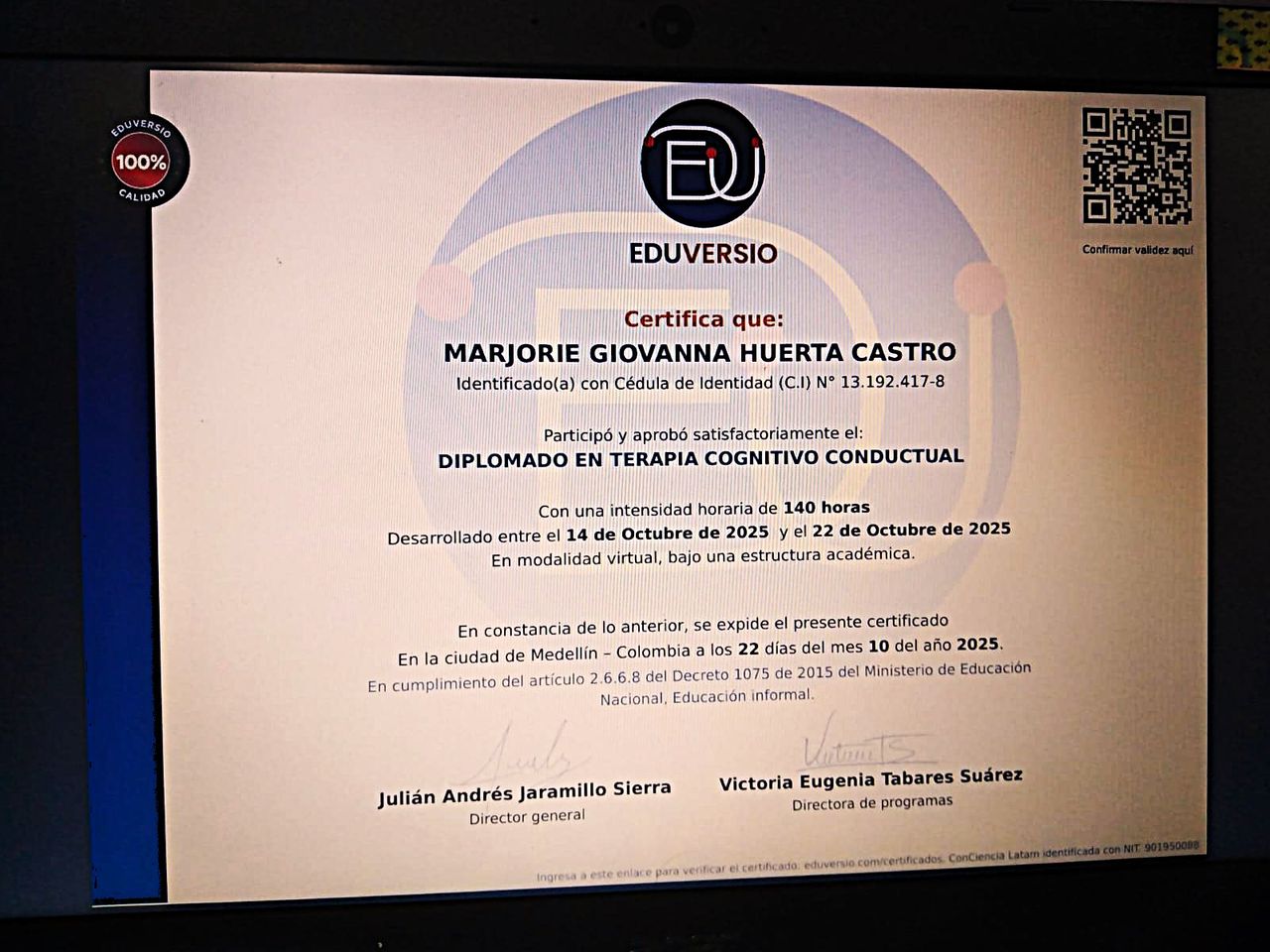 Buen día, soy Marjorie Huerta Castro, psicóloga titulada de la Universidad de Valparaíso. Cuento con 18 años de experiencia laboral, dedicados tanto al área clínica como en población infanto-Juvenil y adultos, a través de la terapia Cognitivo conductual y Experiencial he podido ayudar a varios pacientes a recuperar su salud mental y brillo interior. También, cuento con experiencia en el área laboral, principalmente en salud pre-ocupacional, evaluando a través de test psicológicos a profesionales del área pública y privada. En la terapia individual me especializo en trastornos de ansiedad (estrés), trastornos emocionales (depresión, anhedonia), trastornos adaptativos como: rupturas amorosas, divorcio, duelo, o problemas de adaptación a enfermedad físicas como: diabetes, entre tantas; además, problemas de autoestima, bullying, abuso psicológico y/o físico en la mujer. Me considero una profesional comprometida en el proceso terapéutico de cada individuo, respetando sus tiempos, guiando el autodescubrimiento y crecimiento personal en cada paciente. Ofrezco un espacio de escucha segura y activa, potenciando la introspección y detección de pensamientos y creencias problemáticas que dificultan tu forma de sentir y de actuar y que al mismo tiempo pueden oscurecer tu luz interior.
