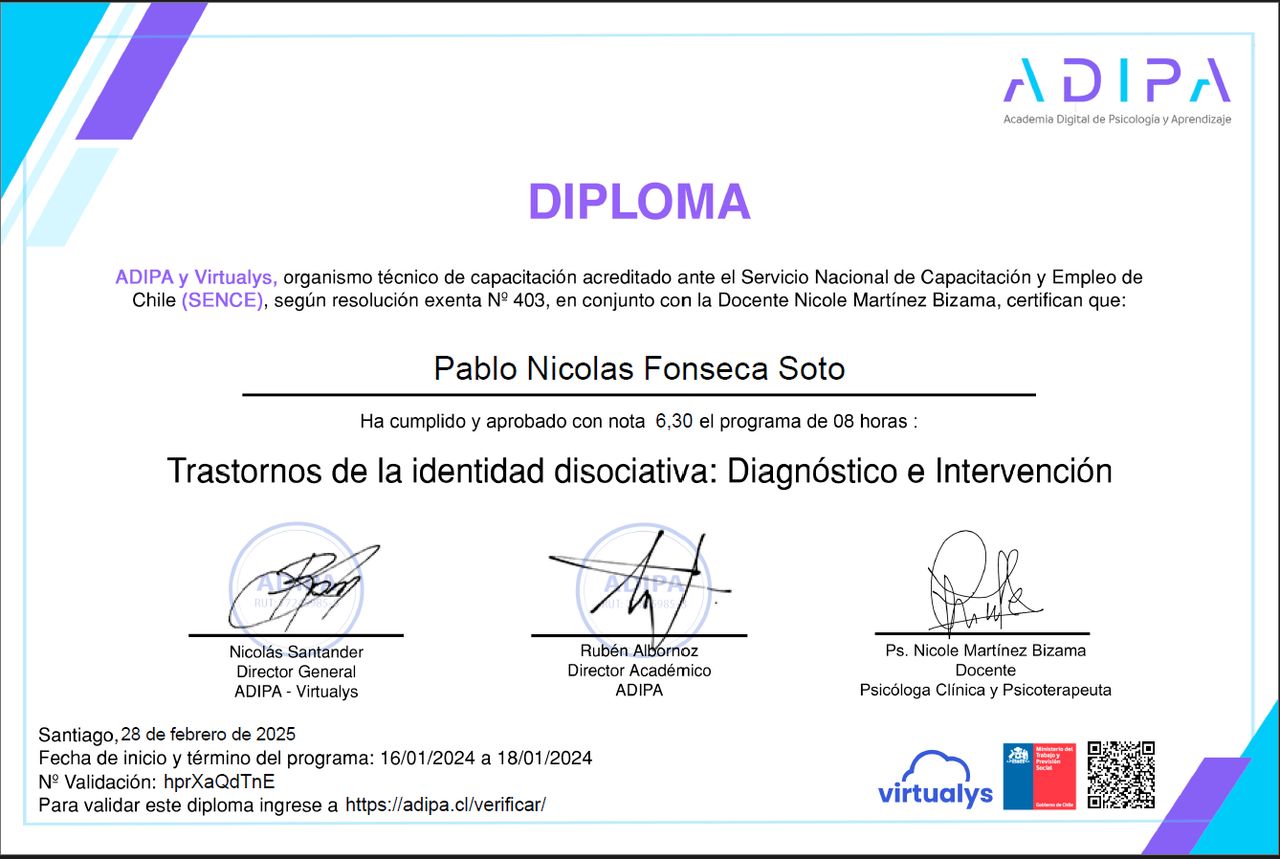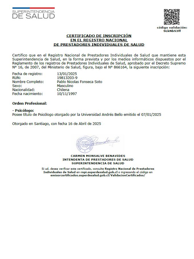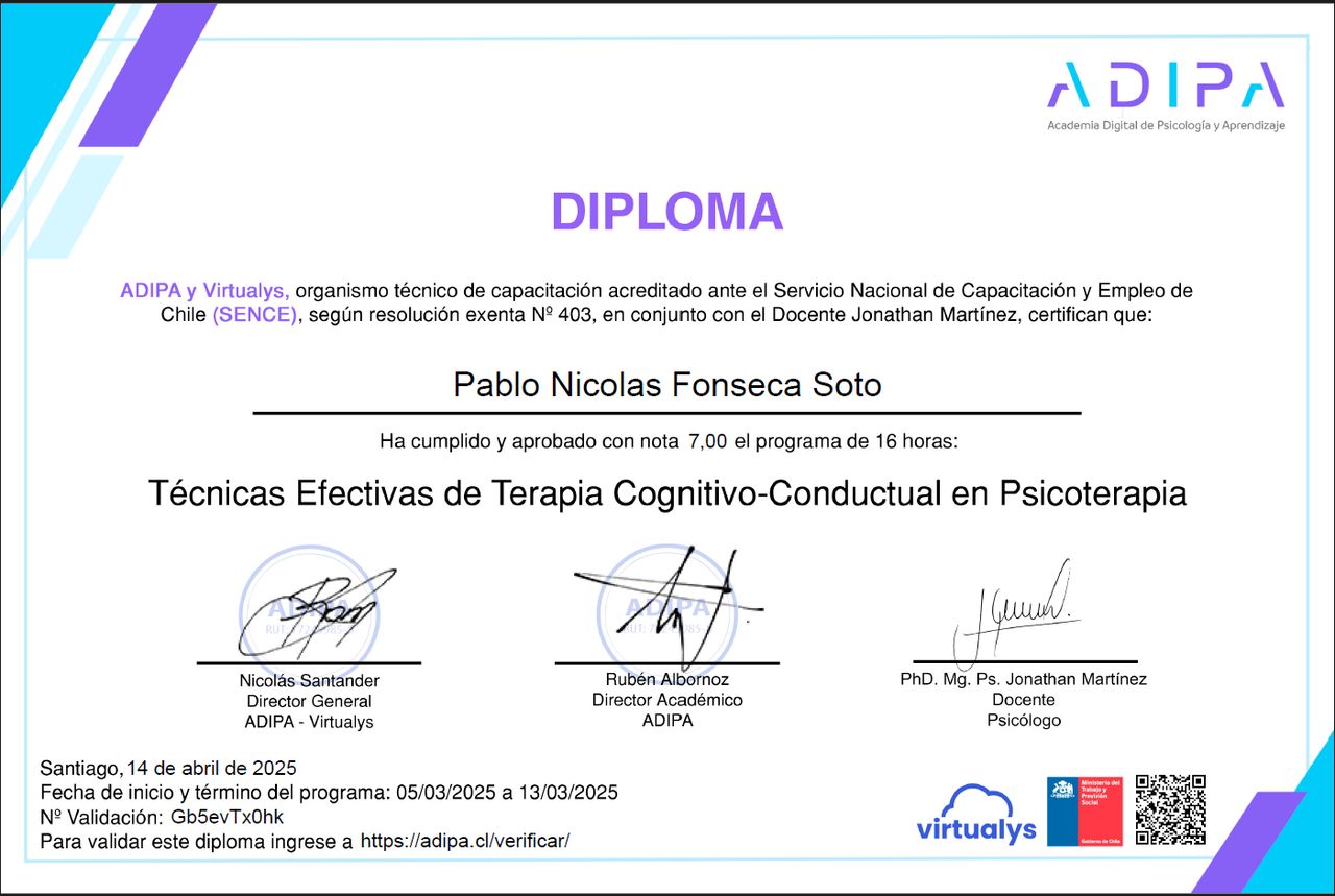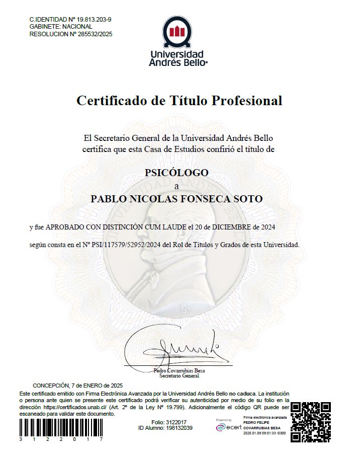 Hola, soy Pablo Fonseca, psicólogo titulado en la Universidad Andrés Bello. Me caracterizo por tener una mirada integrativa, reflexiva y estratégica, que busca conectar lo emocional, lo cognitivo considerando su contexto dentro de cada proceso.