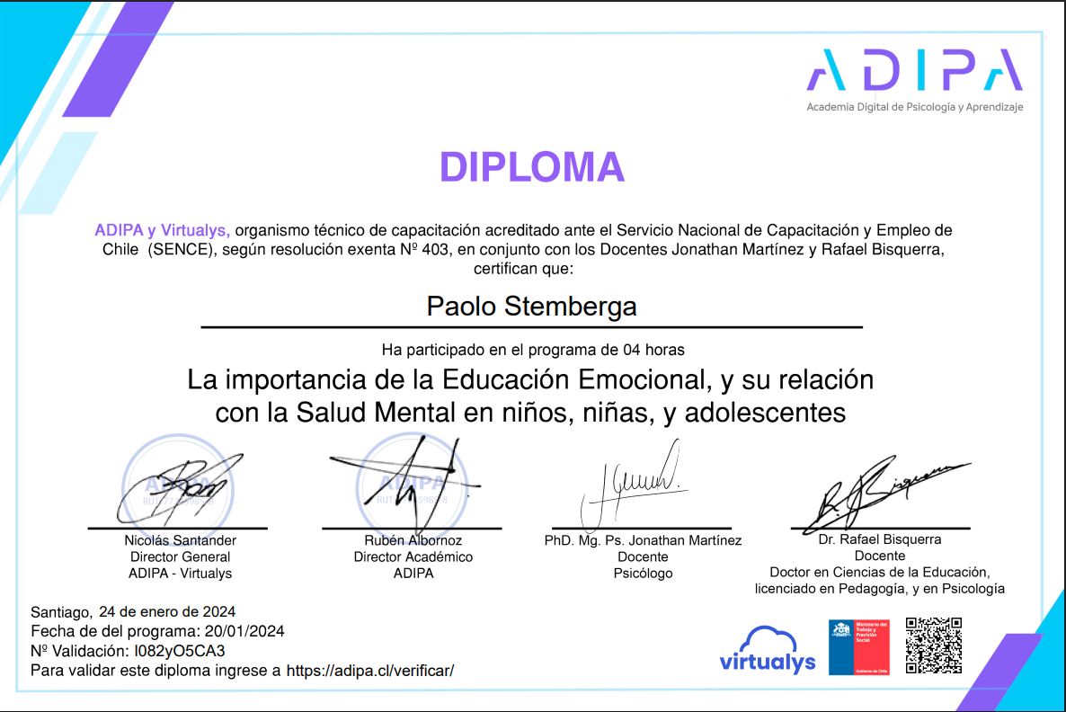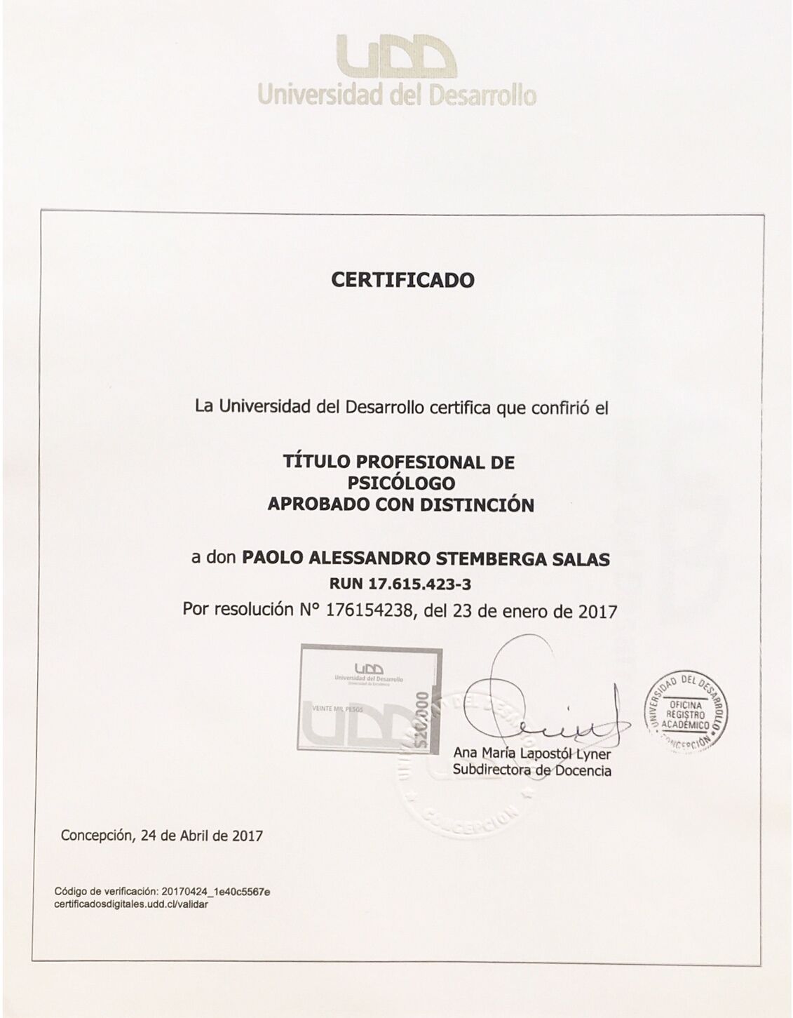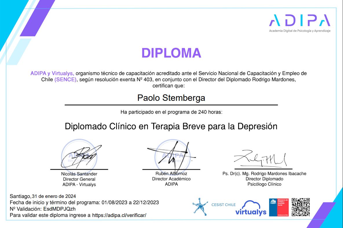 Cuento con un diplomado en Enfoque Estratégico Breve para la Depresión, y junto a los otros estudios que he cursado son para entregar esta atención integradora, ya sea desde comprender el efecto de los fármacos, los procesos de duelo, o las narrativas presentes en nuestras vidas. Esto sin dejar de lado la responsabilidad, ética, actualización y respeto, que son centrales para el trabajo interpersonal.