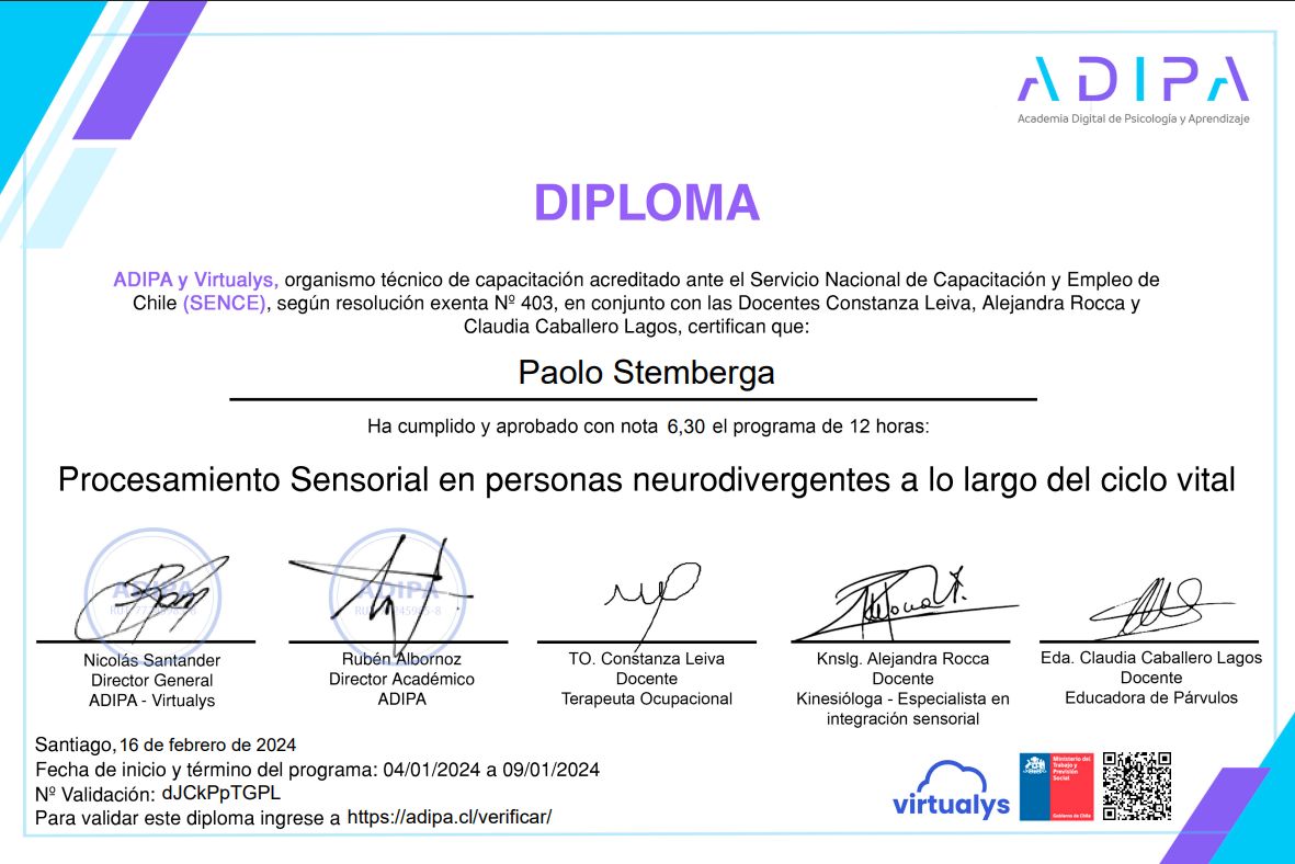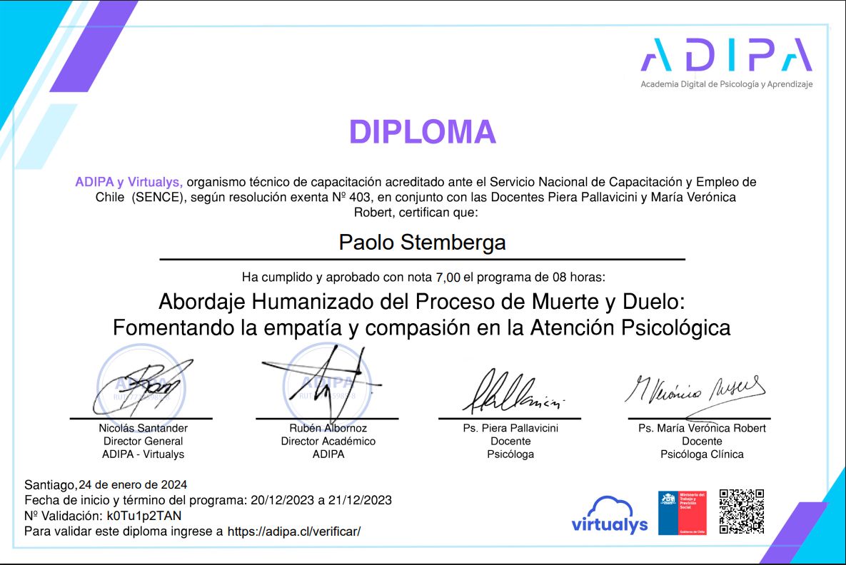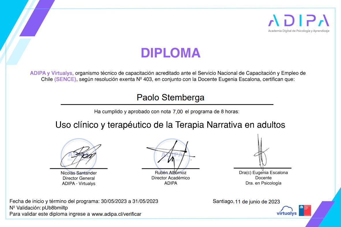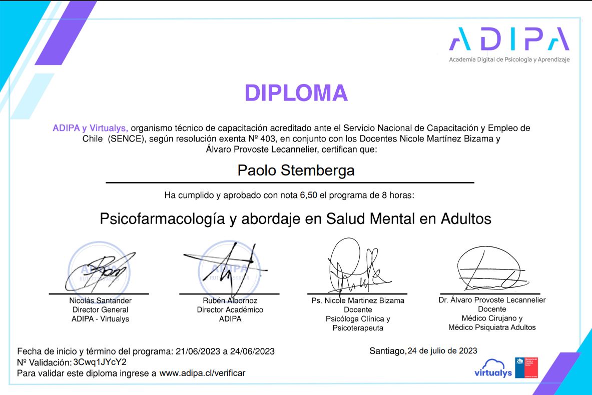 Cuento con un diplomado en Enfoque Estratégico Breve para la Depresión, y junto a los otros estudios que he cursado son para entregar esta atención integradora, ya sea desde comprender el efecto de los fármacos, los procesos de duelo, o las narrativas presentes en nuestras vidas. Esto sin dejar de lado la responsabilidad, ética, actualización y respeto, que son centrales para el trabajo interpersonal.