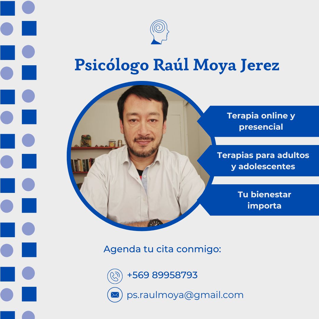 Mi nombre es Raúl Moya Jerez, psicólogo de la universidad USEK. Diplomado en peritaje psicológico y social. Magíster en “Ciencias de la familia” con mención en orientación, Universidad Santiago de Compostela, España. Seminario internacional “Holocausto y conducta Humana”, Centro Yad Vashem, Israel.