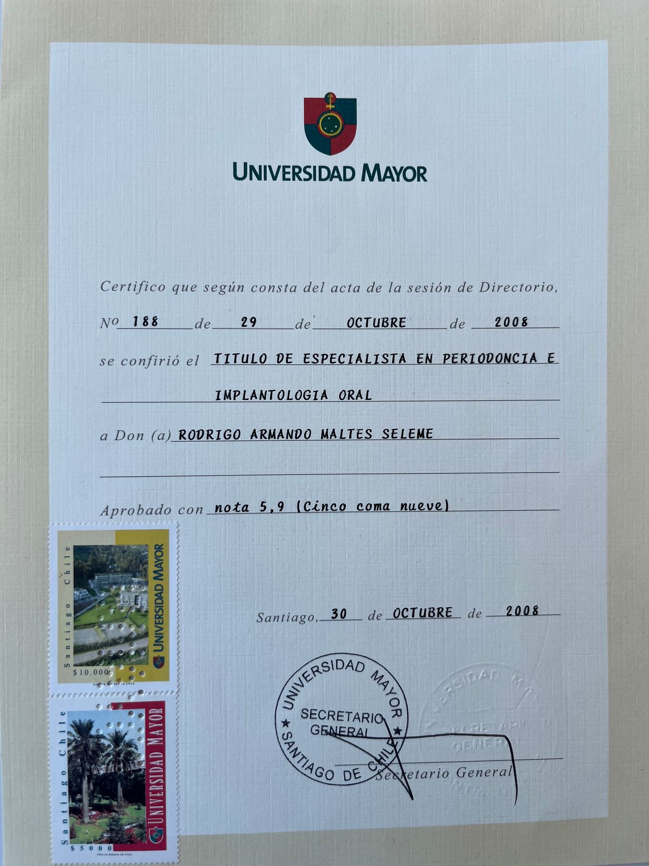 Soy Cirujano Dentista con 26 años de experiencia, egresado con distinción de la Universidad de Chile el año 1994, hice un diplomado de un año de Implantología Oral impartido por la Universidad de Loma Linda, USA el 2004, por lo que tengo 22 años de experiencia en esa área, posteriormente hice la especialidad de Periodoncia e Implantología de 2 años y medio de duración el 2006 en la Universidad Mayor.