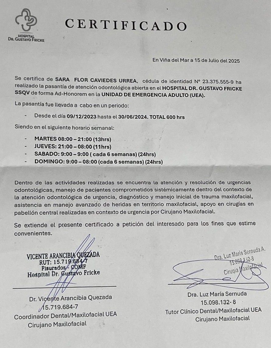 Cuento con formación en urgencias dentales y maxilofaciales en la Unidad de Urgencia del Hospital Gustavo Fricke, donde atendí traumas, abscesos, celulitis y otras emergencias.