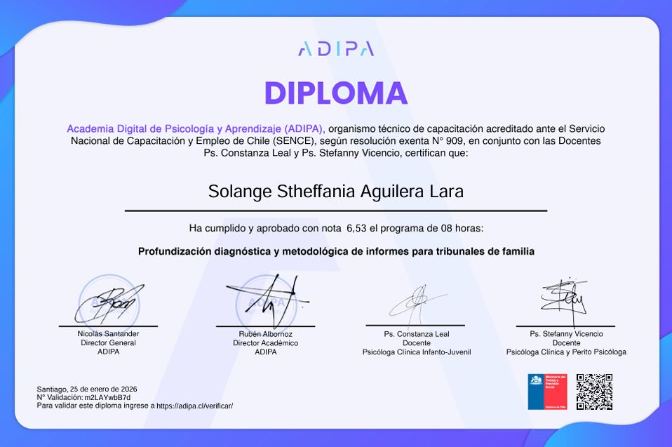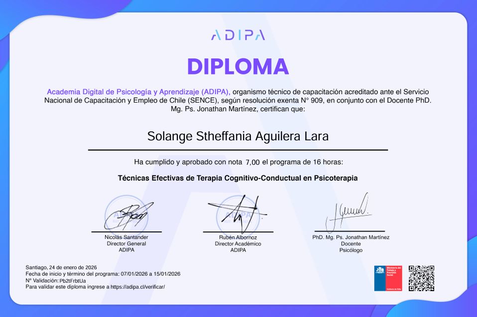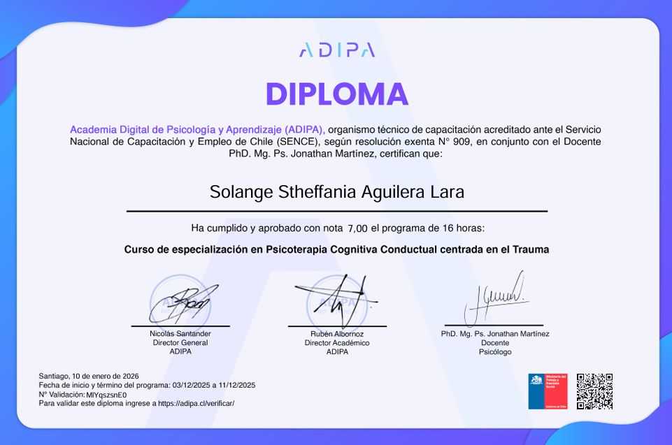 Soy Psicóloga Clínica (Concepción) especializada en ansiedad, estrés, duelo y bienestar emocional, con formación en terapia sistémica e integrativa. Acompaño a personas adultas que están enfrentando dificultades como ansiedad intensa, estrés prolongado, tristeza profunda o procesos de duelo, ayudándolas a recuperar equilibrio emocional y a desarrollar herramientas para afrontar los desafíos cotidianos con mayor seguridad y claridad.