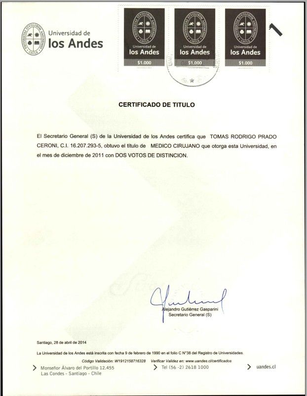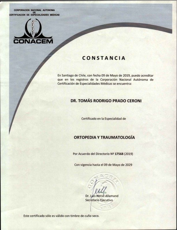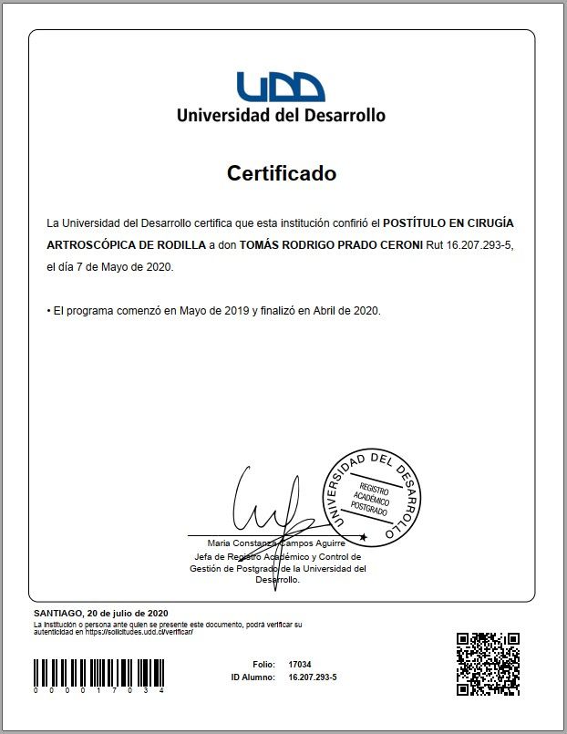 Médico Cirujano titulado en la Universidad de los Andes el 2011, donde también cursé un diplomado en Ciencias de la Investigación y Medicina Basada en la Evidencia. Especialización en Ortopedia y Traumatología en el Hospital Dr. Sótero del Río, certificado por CONACEM. Subespecialidad en Cirugía de Rodilla y Artroscopía en Clínica Alemana – Universidad del Desarrollo, centro acreditado por ISAKOS.