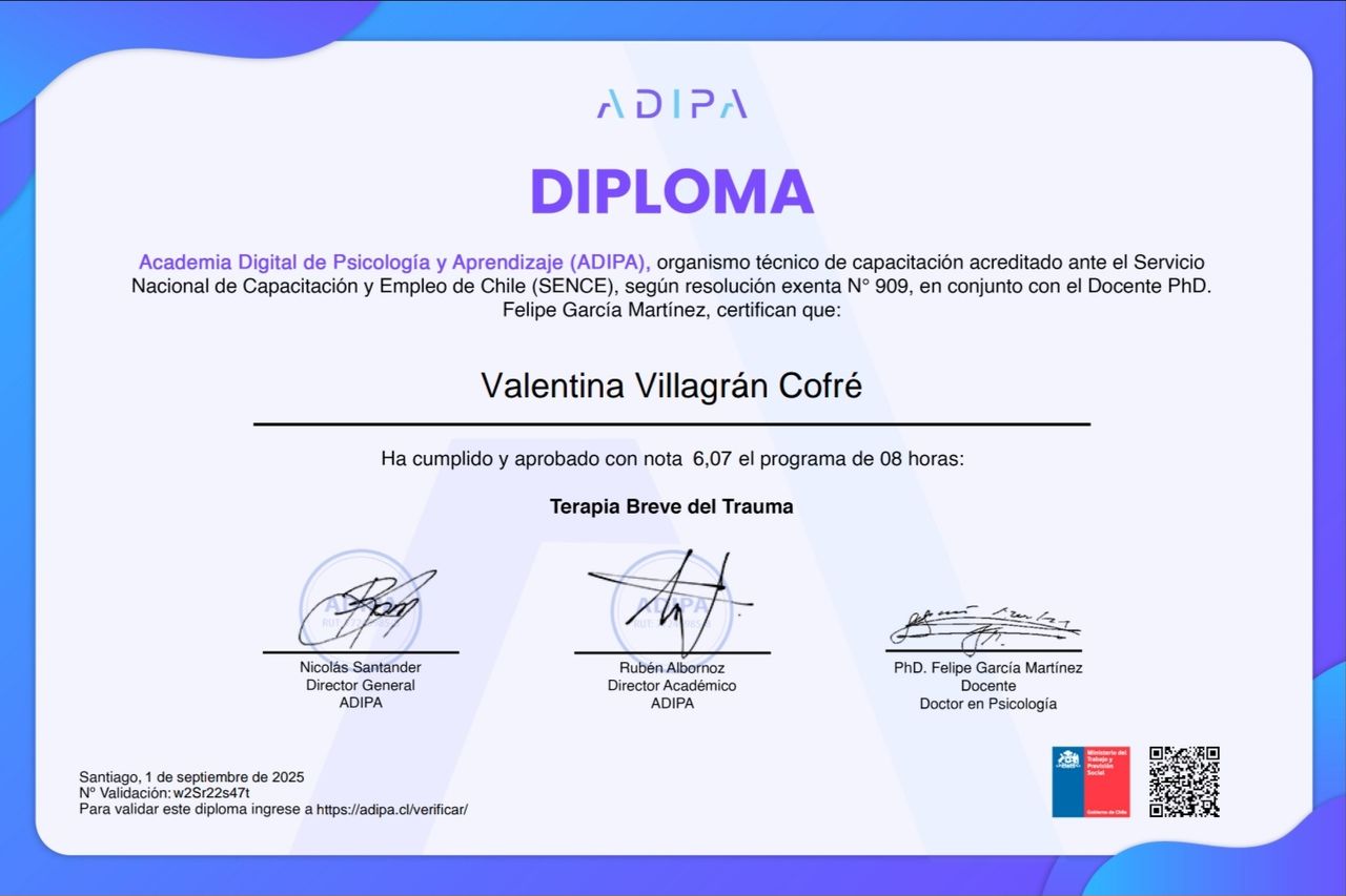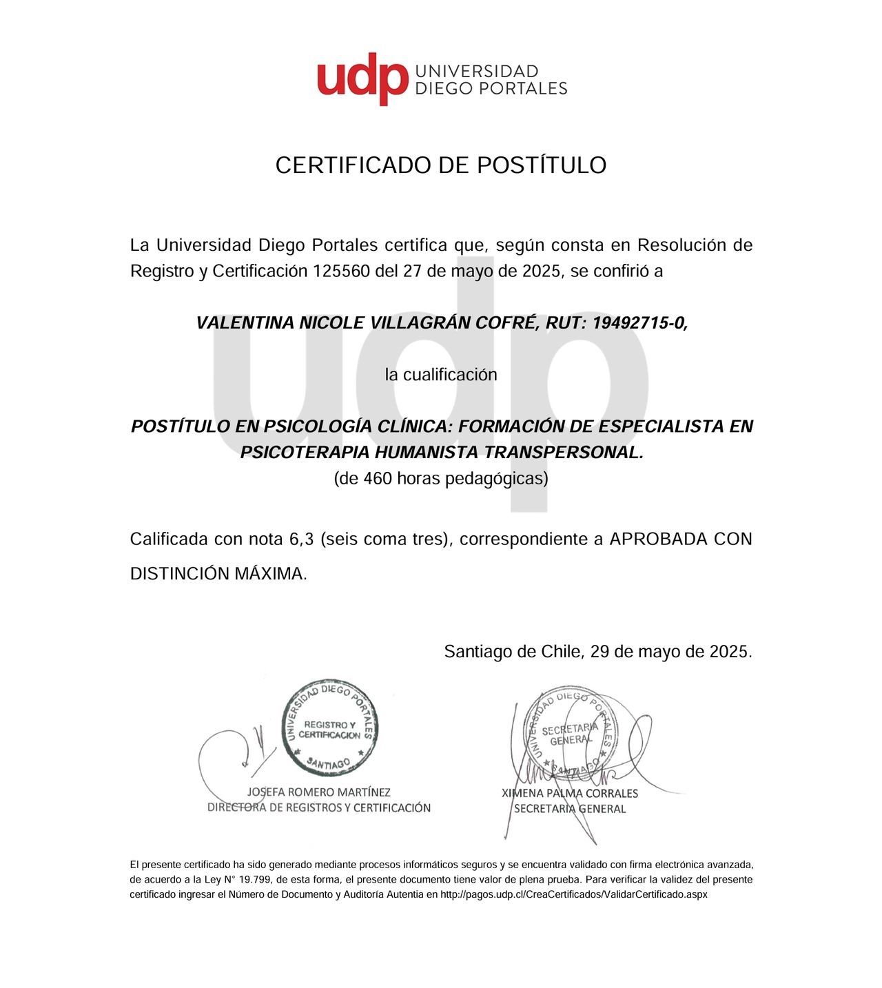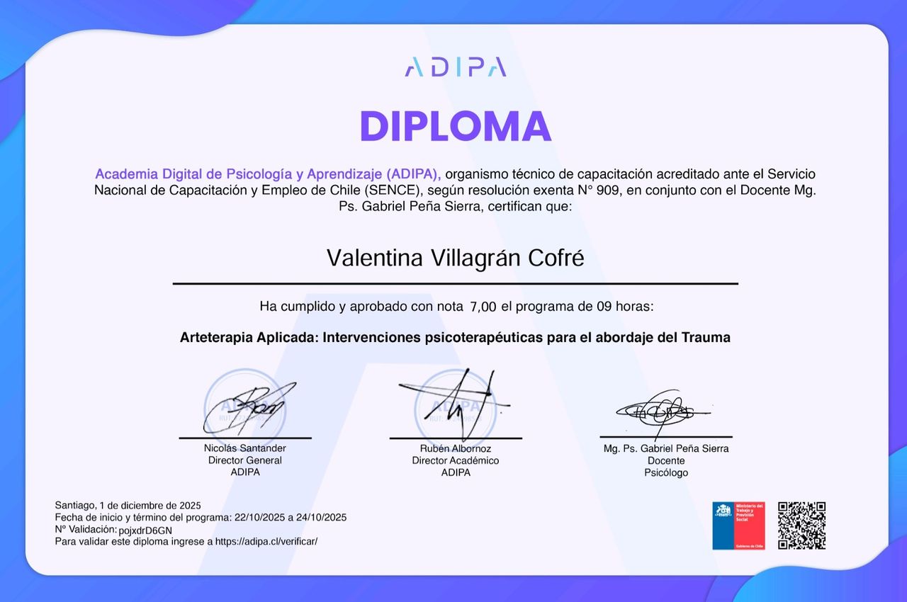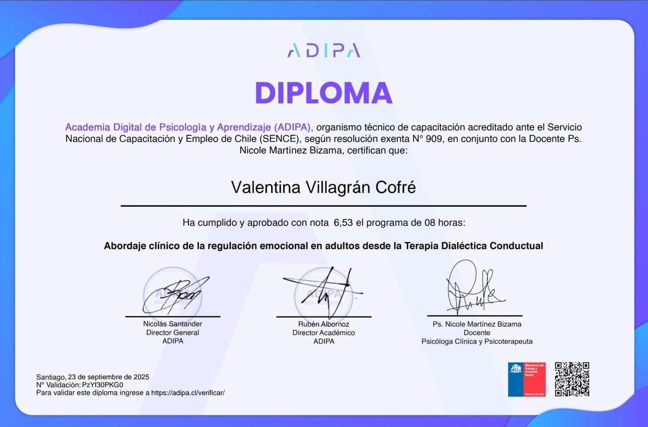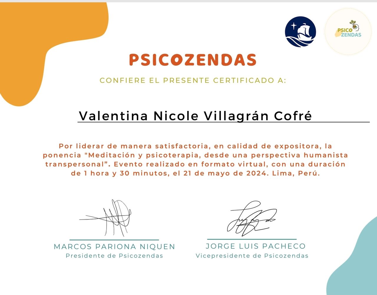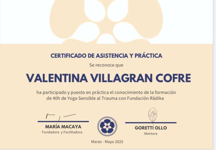 Hola, la atención con Valentina fue excelente… su dedicación y tiempo en las sesiones se ve a distancia. Me ha entregado estrategias que he podido aplicar diariamente y tambien un autoconocimiento que me ha ayudado reconocer patrones que tenía inconscientes en mi.