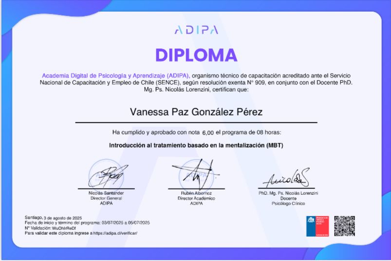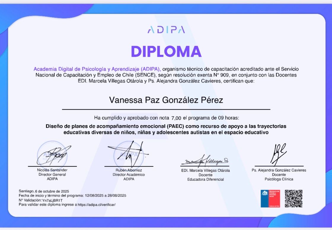 Psicóloga con formación Neurodivergente.Universidad SEK. Diplomado de especialización.cercanía, empatía y respeto.