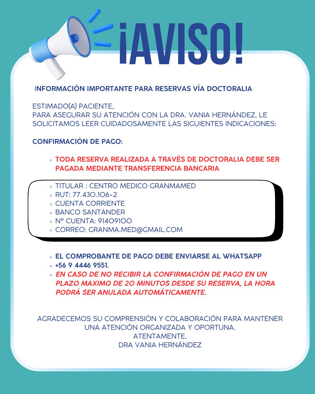 Importante al momento de agendar, LEER INSTRUCCIONES DE RESERVA PARA CONFIRMAR TU PAGO, TIENES SOLO 20 MINUTOS.
