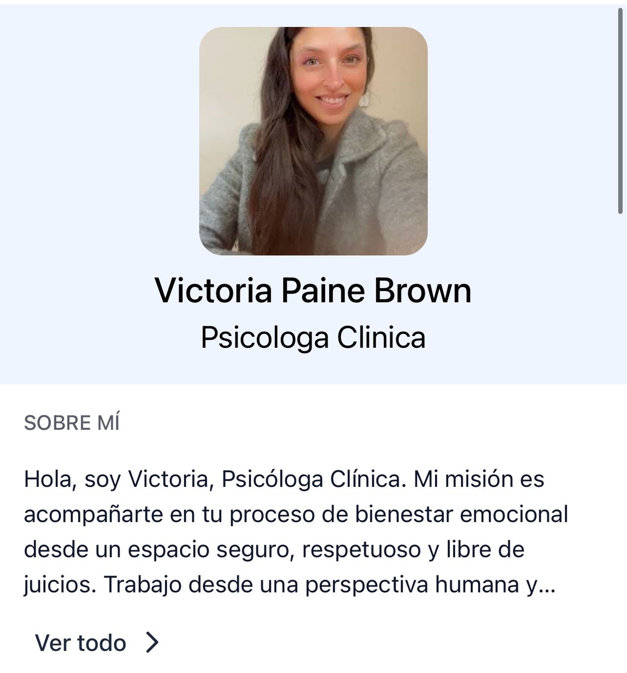 Hola, soy victoria, Psicóloga Clínica. Mi misión es acompañarte en tu proceso de bienestar emocional desde un espacio seguro, respetuoso y libre de juicios. Trabajo desde una perspectiva humana y cercana, donde cada persona es escuchada en profundidad y se le acompaña segun sus necesidades particulares.