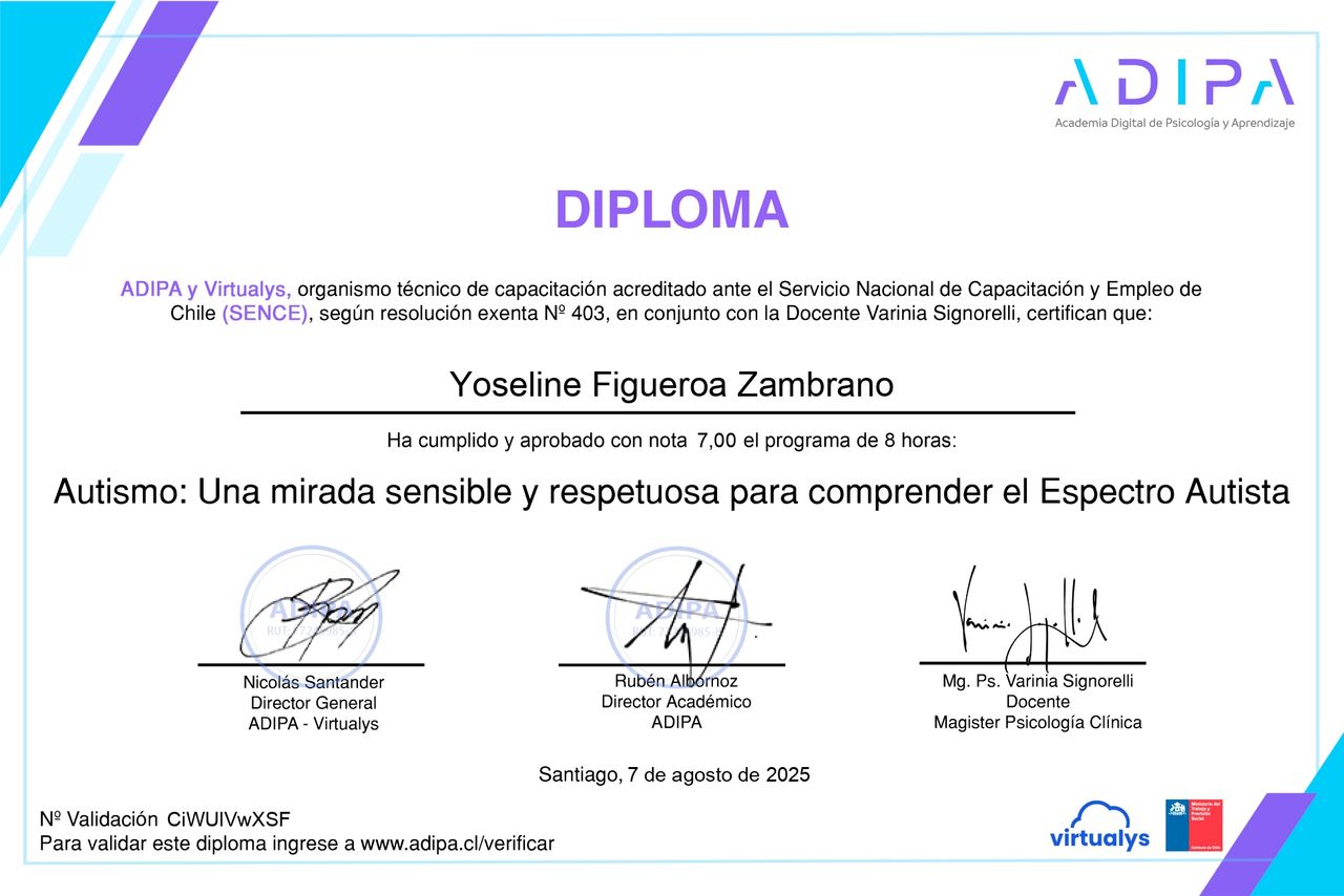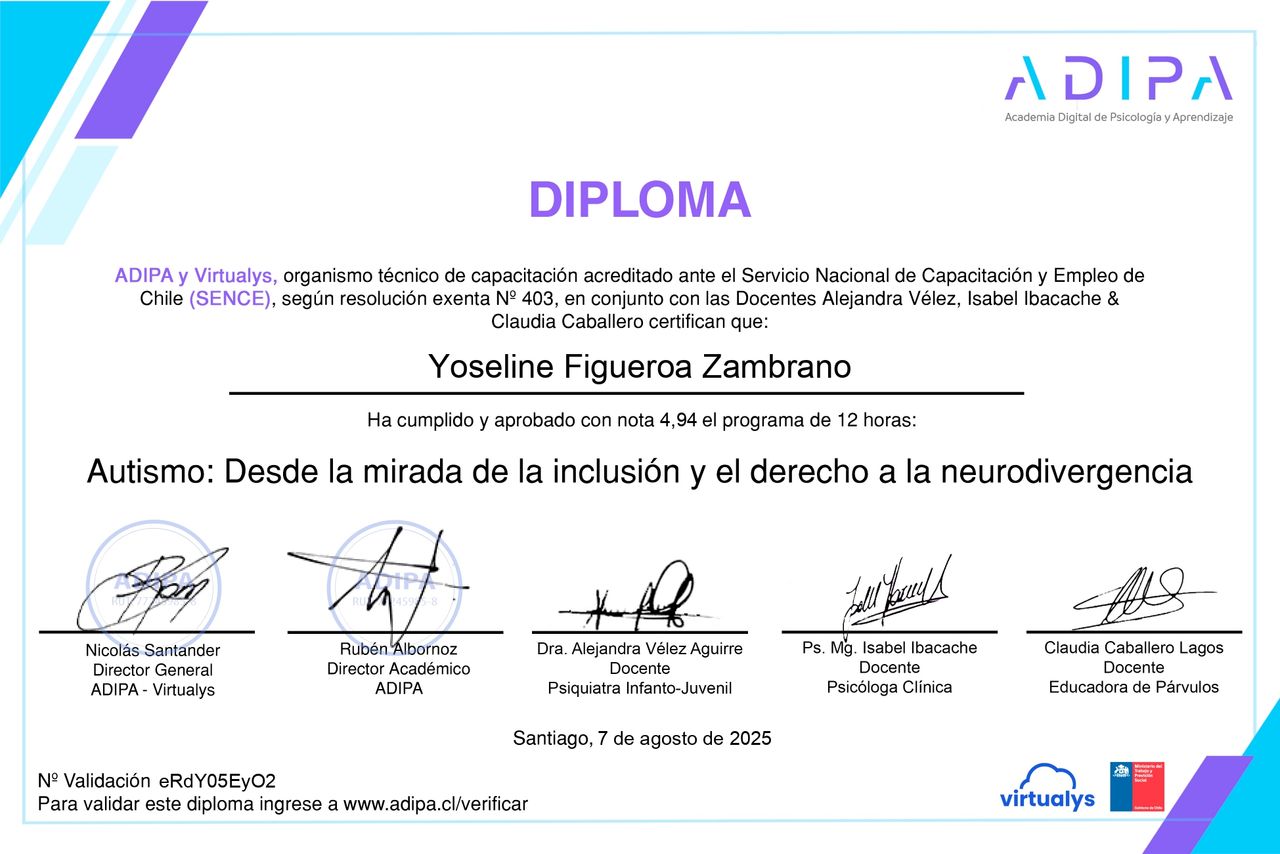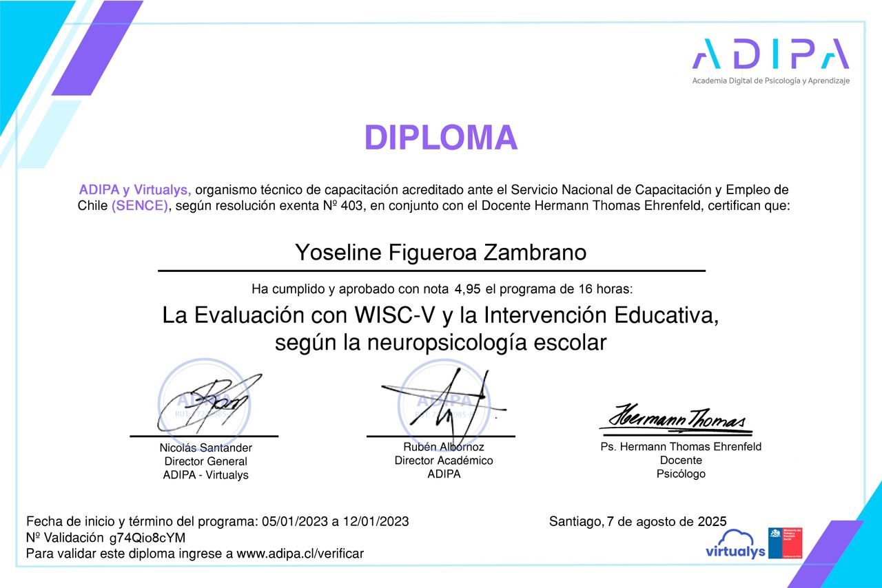 Actualmente curso un Diplomado en Neuropsicología Clínica Infantil, lo que me permite profundizar en la comprensión de los procesos que influyen en el desarrollo y el aprendizaje. Realizo evaluaciones psicométricas con instrumentos estandarizados tales como el WISC-V y el WAIS-IV, con especial foco en personas neurodivergentes y en casos de TEA, TDAH y dificultades de aprendizaje.