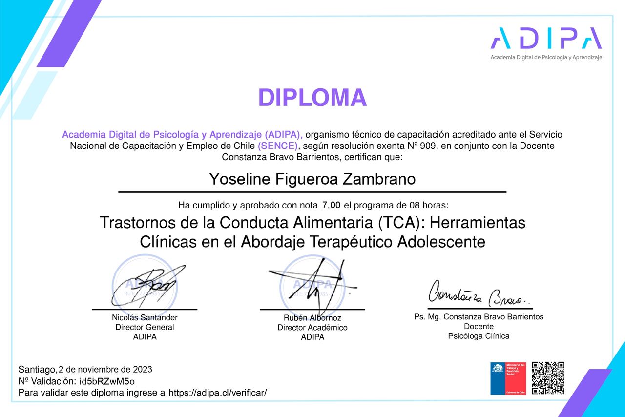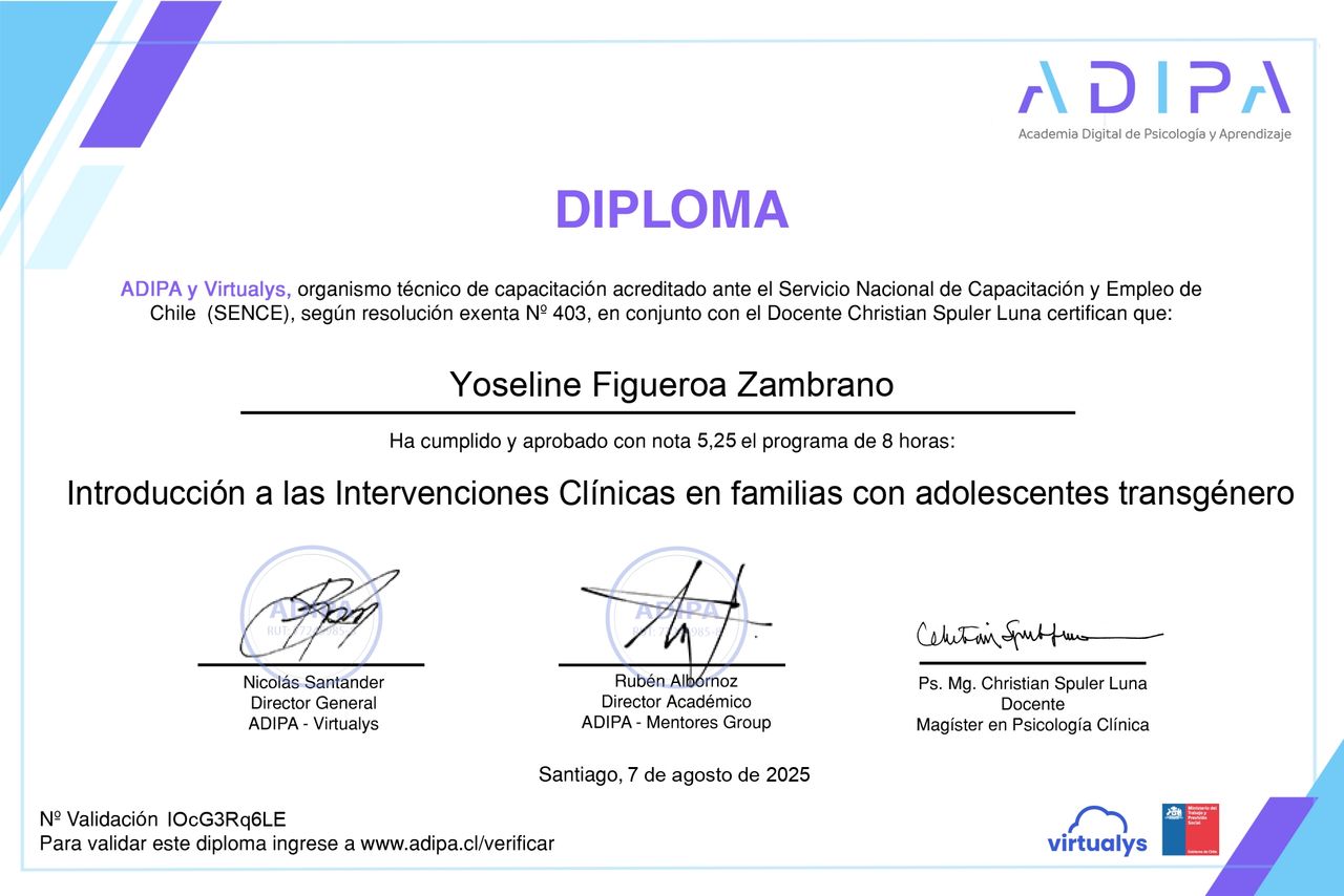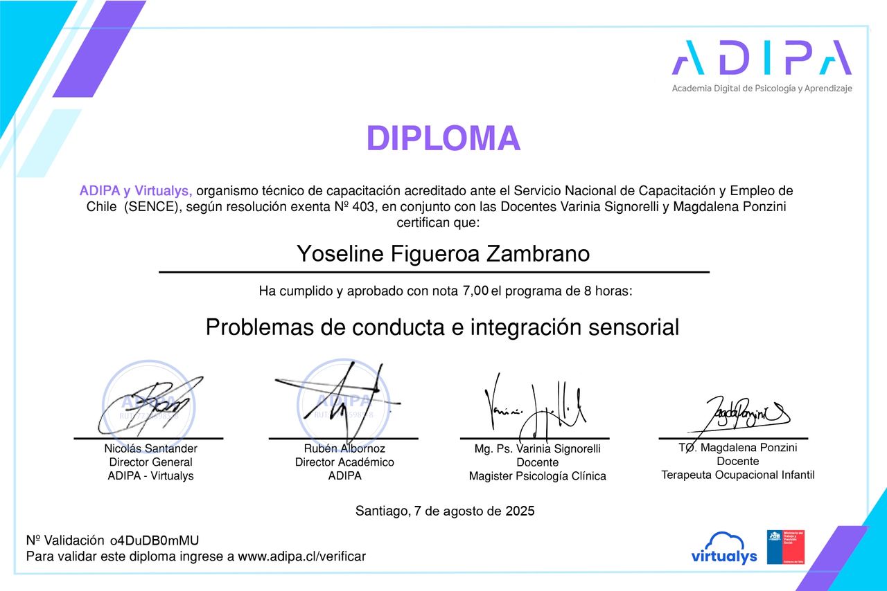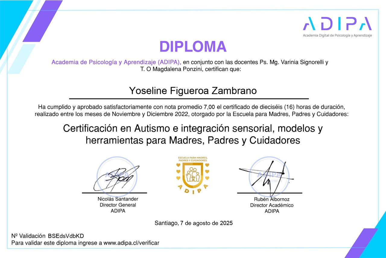Actualmente curso un Diplomado en Neuropsicología Clínica Infantil, lo que me permite profundizar en la comprensión de los procesos que influyen en el desarrollo y el aprendizaje. Realizo evaluaciones psicométricas con instrumentos estandarizados tales como el WISC-V y el WAIS-IV, con especial foco en personas neurodivergentes y en casos de TEA, TDAH y dificultades de aprendizaje.