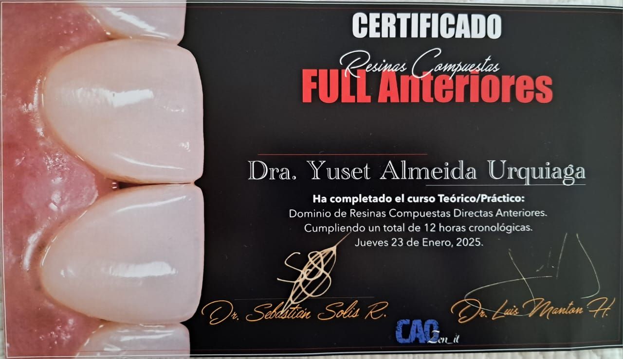 Soy la Dra. Yuset Almeida, odontóloga cubana con revalidación de título en la Universidad de Chile y especialista en rehabilitación oral. Con más de 8 años de experiencia, me especializo en rehabilitación fija, removible y sobre implantes, además de procedimientos de odontología general. Dentro de mis objetivos, busco que el paciente encuentre en la consulta un espacio para sentirse escuchado y para sonreír con confianza. Promuevo la educación y comparto el conocimiento necesario para que la salud bucal se mantenga a lo largo del tiempo, adaptando cada tratamiento a las necesidades y preferencias de cada persona
