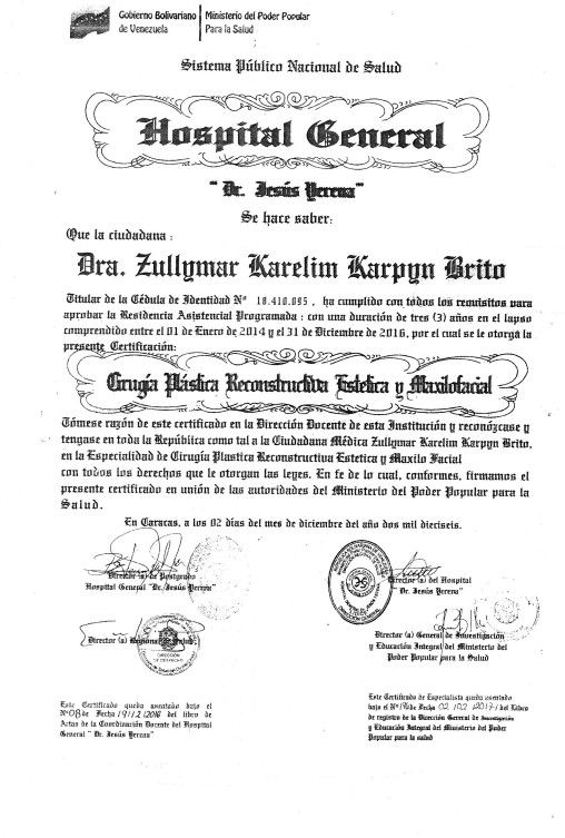 La Dra. Zullymar Karpyn es una maravillosa Médico Cirujano titulada en el año 2008 por la Universidad de Carabobo, Venezuela. Cuenta con certificacion de EUNACOM. Más tarde realizó su especialización en Cirugía General y luego subespecialización en Cirugía Plástica y Reparadora ambas certificadas por CONACEM. Actualmente forma parte del servicio de cirugía plástica del Hospital Clínico Herminda Martin de Chillán y atiende por consultas en Karpyn Clinic; Además, forma parte de la Sociedad Venezolana de cirugía Plástica, Sociedad Chilena de cirugía general, Sociedad Chilena de cirugía Plástica y es Miembro de la International Society of Aesthetic Plastic Surgery.